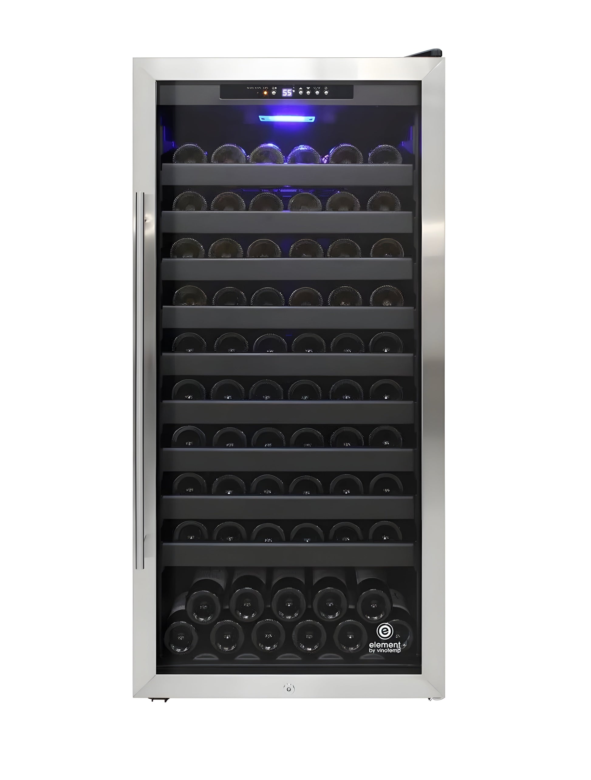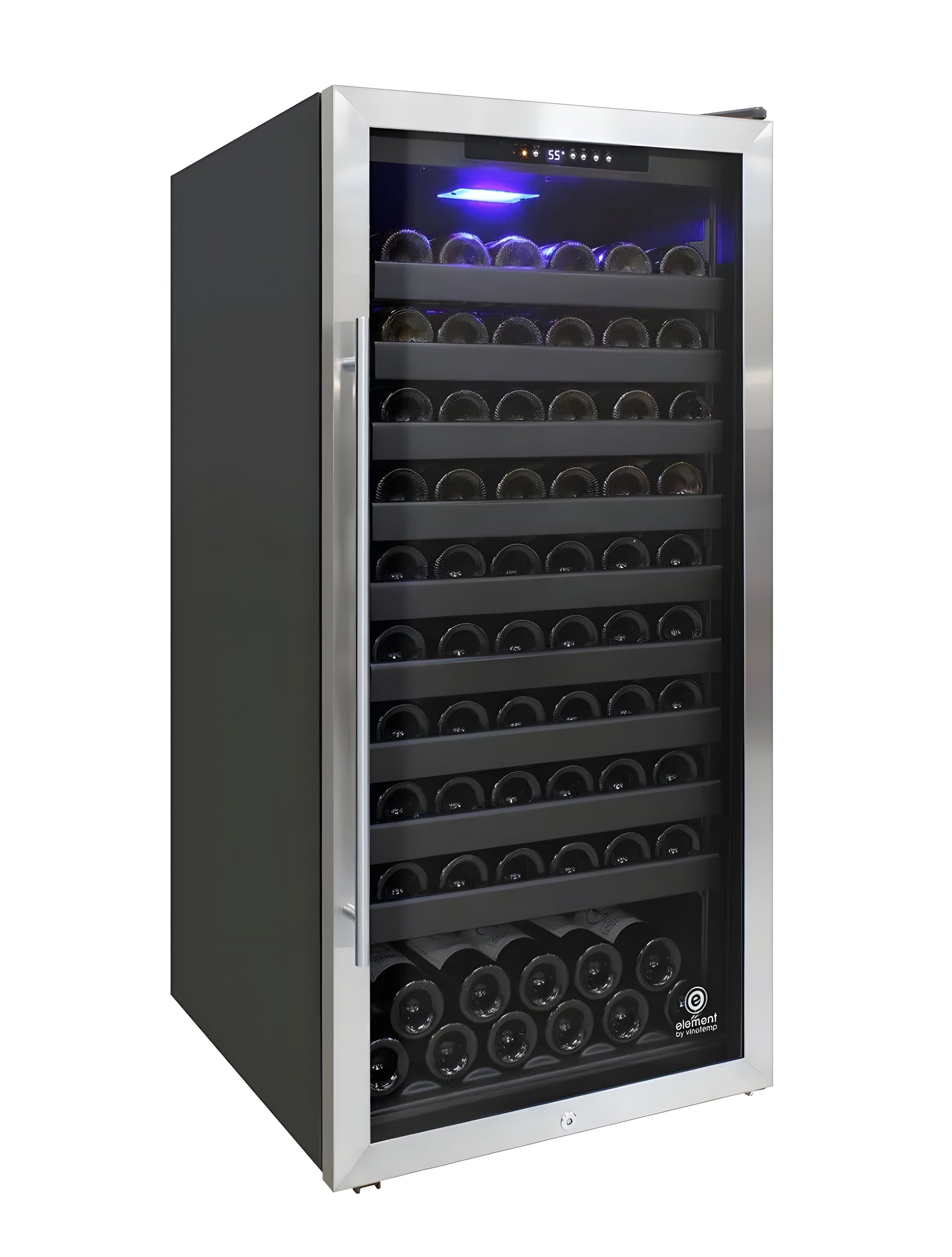For sleek, stylish and sophisticated wine storage for your prized collection, the 114-Bottle Freestanding Wine Cooler by Vinotemp is the perfect solution. This single-zone wine cooler allows you to set the right temperature to provide optimum condition for up to 114 bottles of your wine collection. A conveniently located digital control panel makes setting the ideal temperature a simple task. Contemporary styling includes a black body and a dual-pane glass door. Vinotemp’s Ouzo wine racks with black lip cradles your collection behind a glass door with stainless steel frame. Nine sliding shelves and a bulk storage section provide easy access to your storage space. The interior LED lighting creates a gorgeous display and makes it easy to find your favorite bottles. Stainless steel frame and door lock add to the style and functionality of this cooler. This cooler is designed for freestanding installation and best suited for medium sized wine collection.