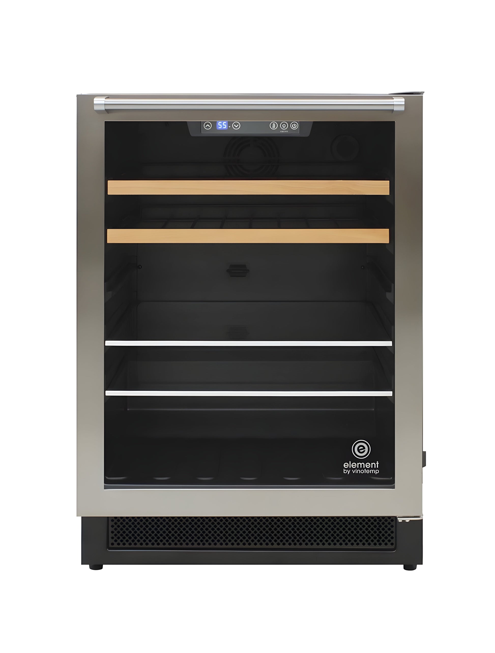 Vinotemp's 24-Inch Wine & Beverage Cooler with Top Handle makes the perfect, stylish way to display your wine bottles and beverage cans. This unit features two metal wine shelves with wooden lip, two tempered glass shelves, black cabinet body, dual-pane glass door with seamless stainless steel and a top pole handle. Soft blue interior LED lighting illuminates the cooler’s contents behind a seamless stainless steel door, making this wine & beverage cooler an aesthetically pleasing addition to any room. A centrally located digital control panel makes adjusting the temperature simple while providing peace of mind that your wines and beverages are always ready to be enjoyed. This wine & beverage cooler is equipped with front exhaust, which allows it to be either installed built-in or freestanding. Beautiful and functional, this unit has a sleek, elegant design that will give your wine & beverage collection a touch of luxury and the distinction it deserves.