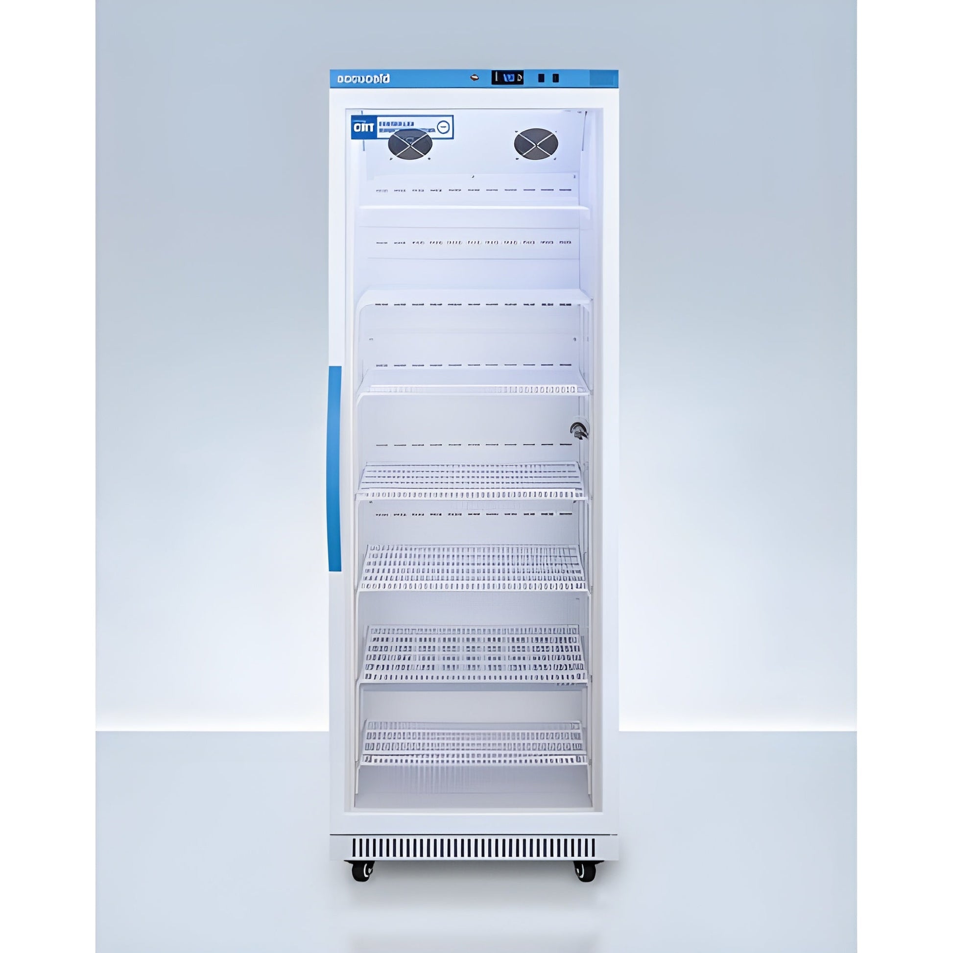Accucold Performance Series Controlled Room Temperature CabinetThe ARG12PV-CRT is a 12 cu.ft. upright storage unit designed for stable room temperature medication storage. Pre-set to 72ºF, it offers an adjustable range from 68º to 77ºF. An externally located microprocessor temperature controller reduces door openings, while a buffered temperature probe in a glycol-filled bottle ensures precise monitoring. Audible and visual alarms alert for temperature deviations, power failure, door openings, and sensor issues. Inside, adjustable cycle defrost prevents temperature spikes, while dual internal fans maintain uniform cooling. The unit features seven adjustable shelves, LED lighting, and a white powder-coated metal interior for durability. A double-pane tempered glass door with a self-closing, reversible design offers a full view of stored items. The factory-installed antimicrobial handle helps prevent germ spread, and a factory-installed lock enhances security. Designed with hydrocarbon refrigerant, it operates efficiently in ambient temperatures from 68ºF to 86ºF and is compatible with Pyxis, Omnicell, and AcuDose RX systems.
