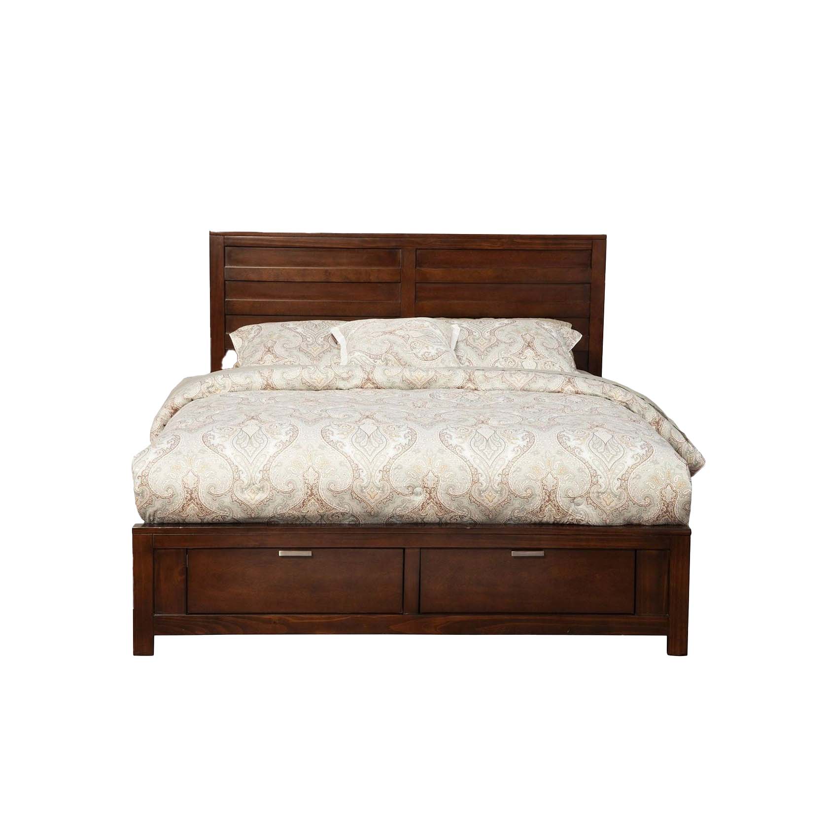 The Carmel Storage Platform Bed combines functionality and contemporary style. The beautiful panel headboard is striking in a warm Cappuccino finish. Two storage drawers provide a place to put pillows, blankets, and linens. Simple nickel drawer handles accent the piece. The bed comes with a complete set of slats, no box spring required. Available in multiple sizes. Coordinates with other pieces from the Alpine Furniture Carmel bedroom collection sold separately.