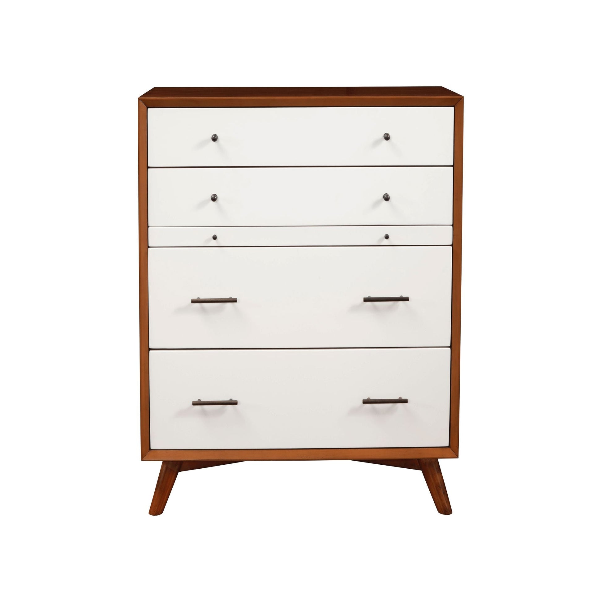 A: The Alpine Flynn Multifunction Chest is a stylish mid-century modern storage piece featuring a two-tone acorn and white finish, four spacious drawers, and a convenient pull-out tray for added functionality.