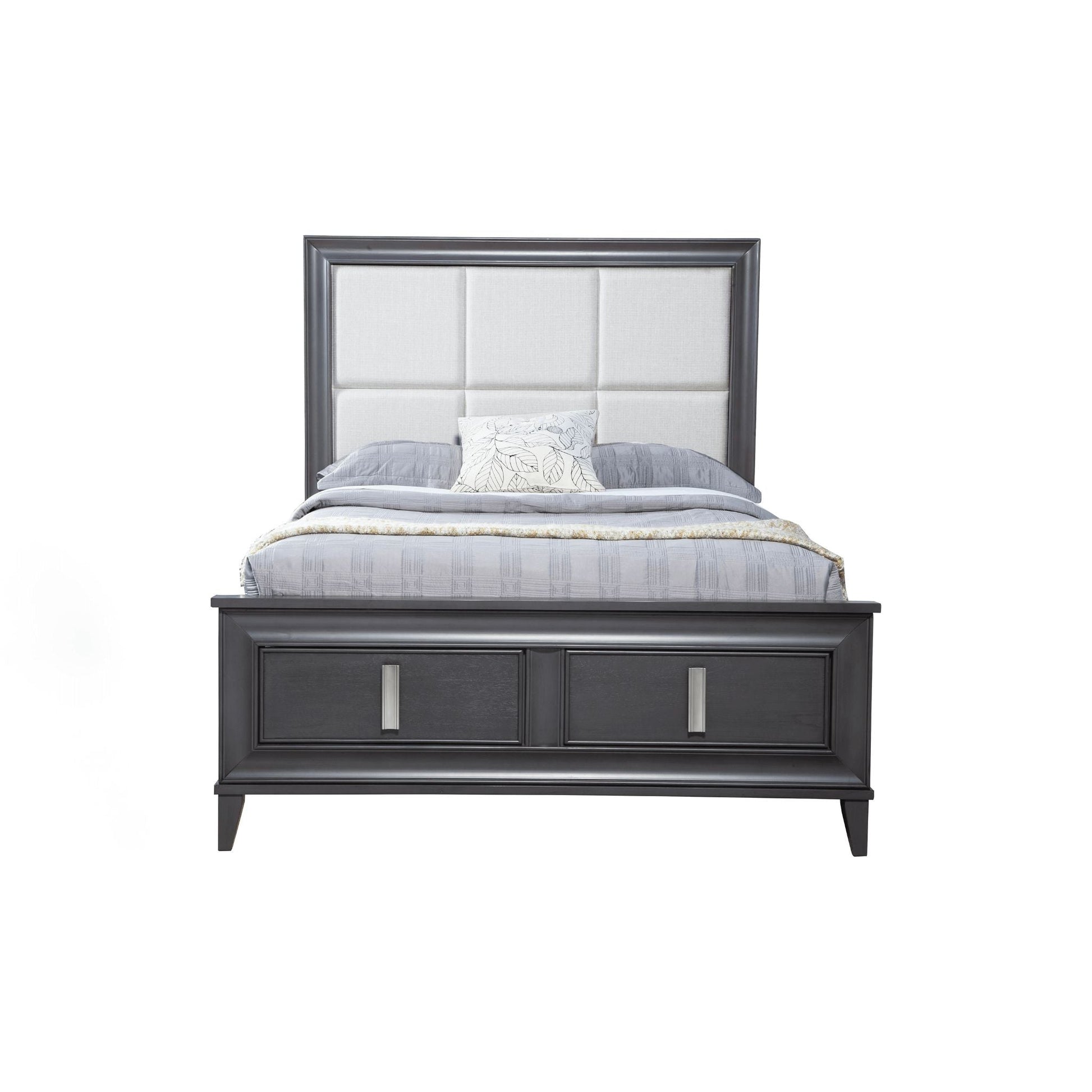 The Lorraine Storage Platform Bed combines function and contemporary style. Made from Pine solids, and finished in Dark Gray, the striking headboard features a cream-colored fabric insert. The two storage drawers in the footboard are accented by distinctive nickel vertical handles. This platform bed can be used with only a mattress, no box spring required. Available in multiple sizes. Coordinates with other pieces from the Alpine Furniture Lorraine bedroom collection sold separately.
