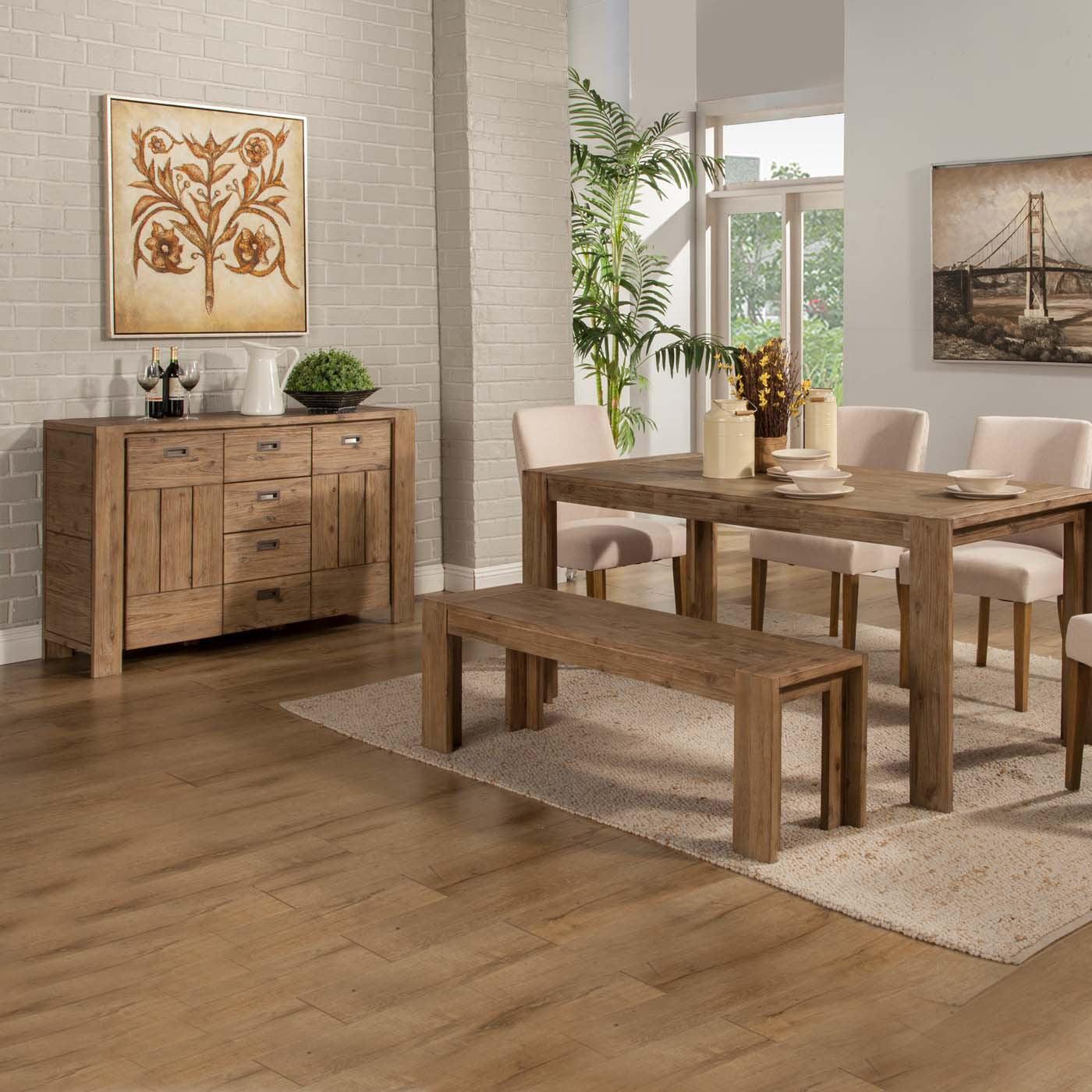 The Seashore Sideboard matches the dining group or can be used in any rustic setting. Brass hardware compliments the Sandblasted Antique Natural finish on solid Acacia wood. Handcrafted in Indonesia, this fully assembled piece provides ample storage with four drawers and cabinets with adjustable shelves.