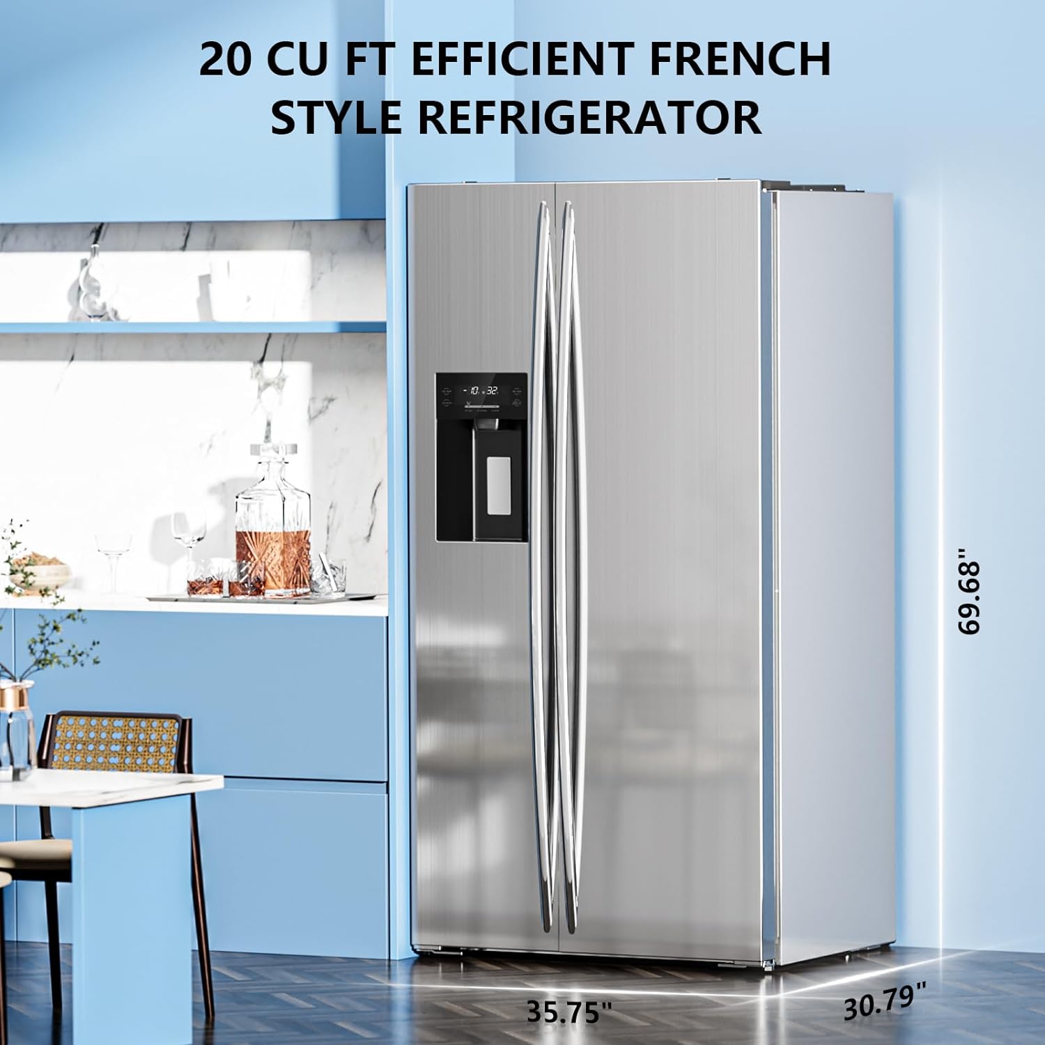 - Large capacity and modern design: This French door refrigerator 30.79"D x 35.75"W x 69.68"H, with freezing area on the left and refrigerator area on the right, different storage structures and large storage enough to suit the various needs of the home