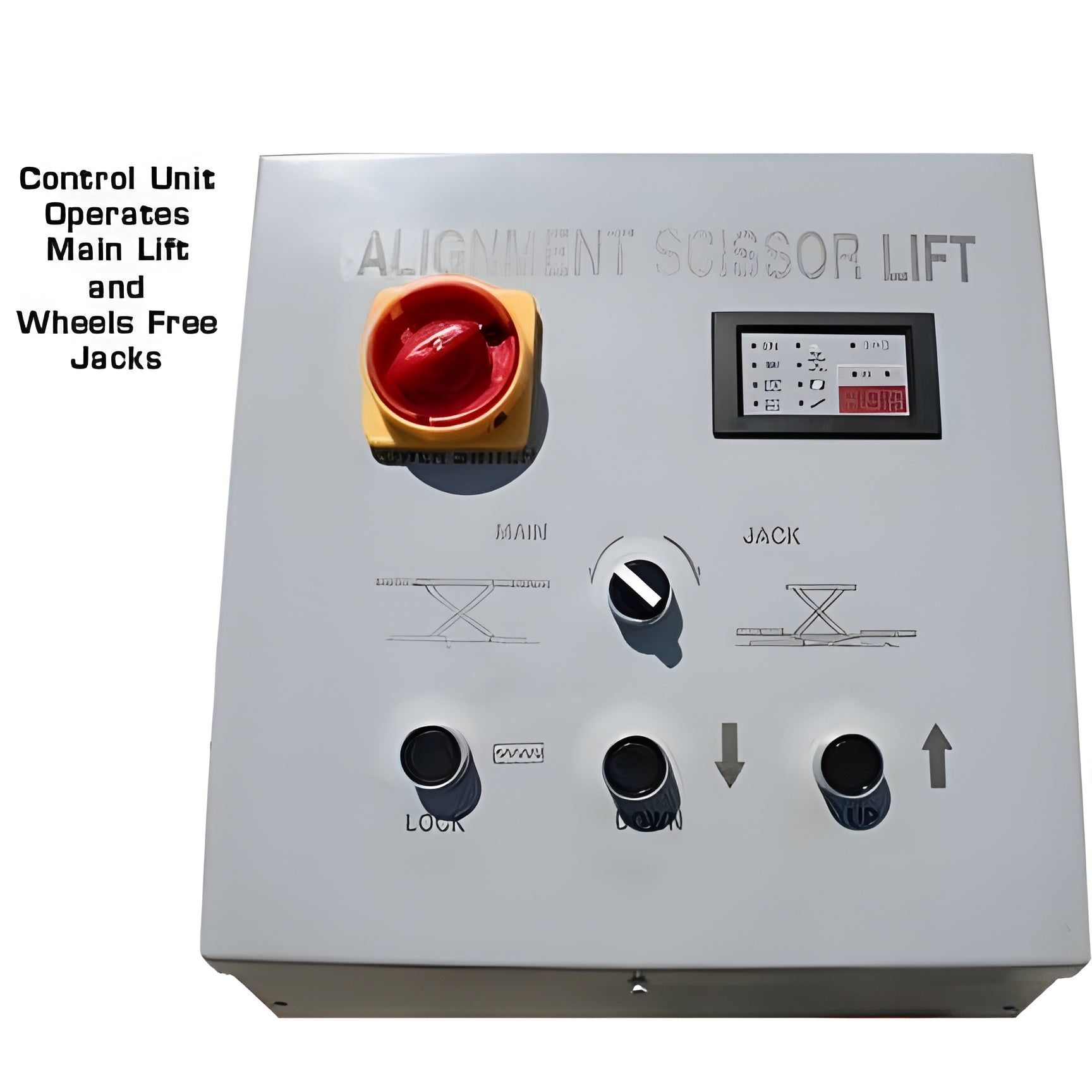 A: Yes, it is equipped with air-operated controls, making it simple and efficient to lift and lower vehicles for alignment and maintenance.