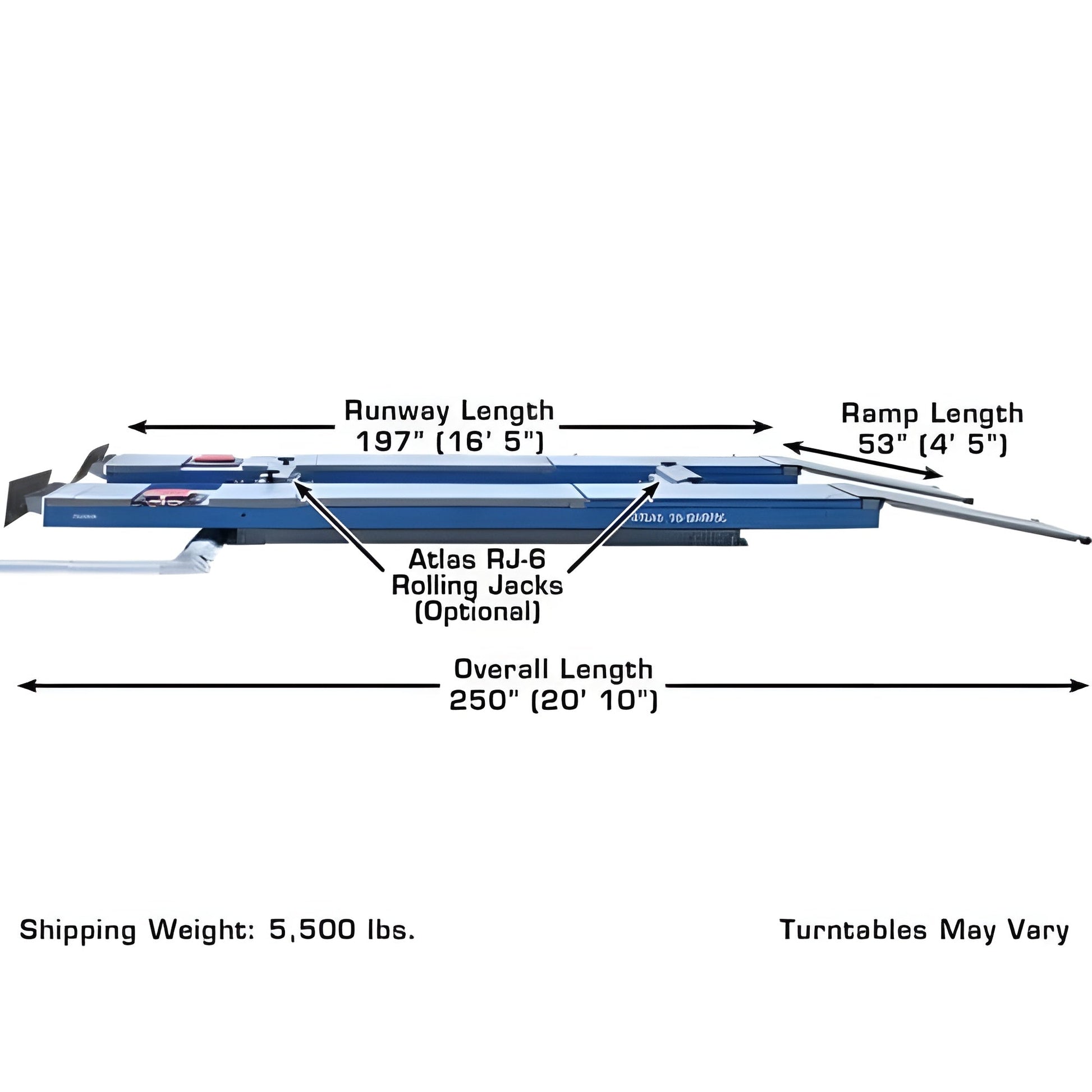 Welded rails on the inside of the runways are standard on all lifts, allowing the bundled Atlas RJ-6 (6,000 lbs. capacity) air/hydraulic rolling jack system on his Atlas alignment scissor lift. The AtlasRJ-6 is designed and engineered to operate on “delivered” air pressure of between 70-105 PSI.