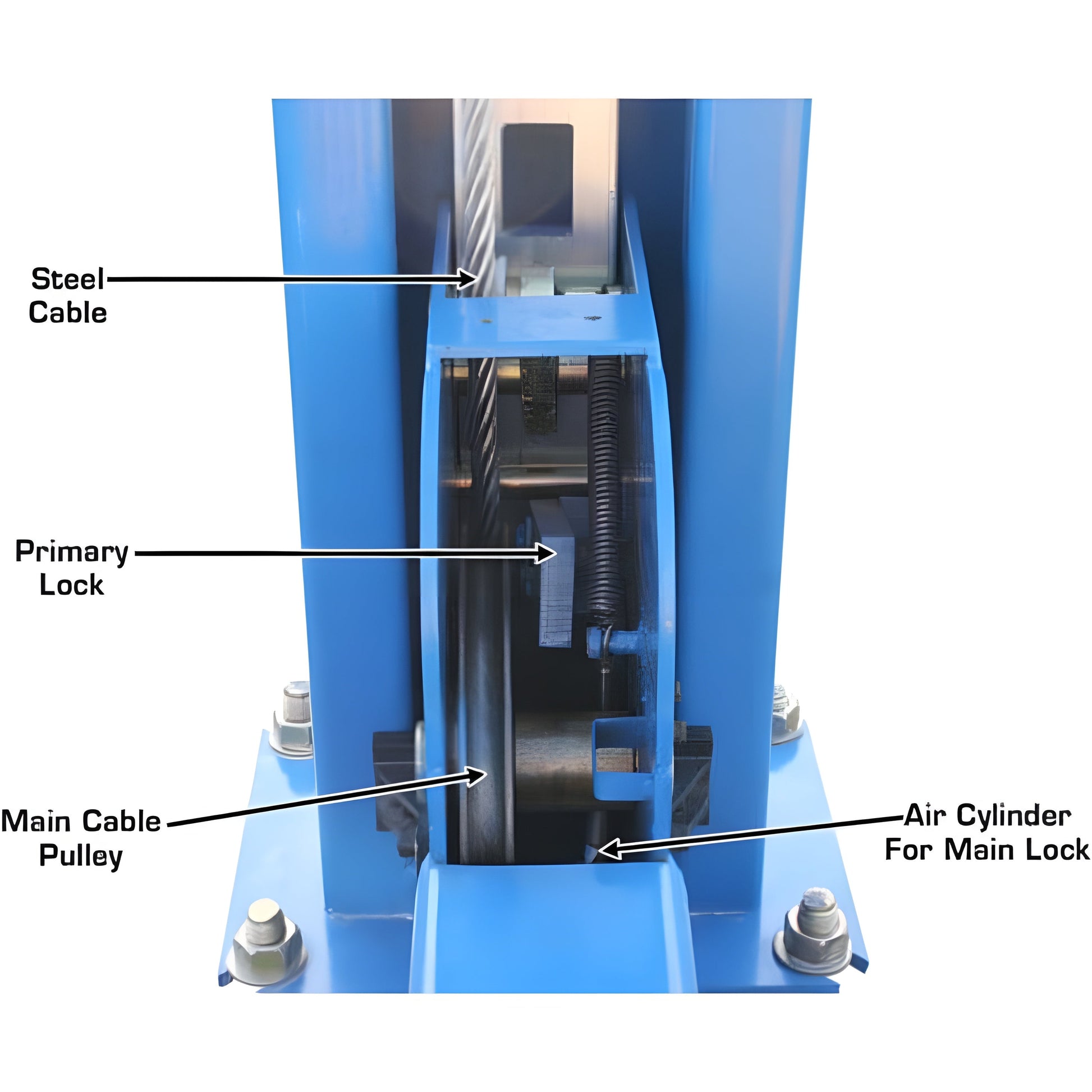 The Atlas 414A uses a high strength cable system (with a under runway oversized hydraulic cylinder) powered by a 220 volt (single phase) power unit to raise and lower the lift. Many competitors use an old style chain lifting system with an exposed hydraulic cylinder system. Old style chain lifts are difficult to level properly and the exposed hydraulic cylinder is responsible for numerous door dings.