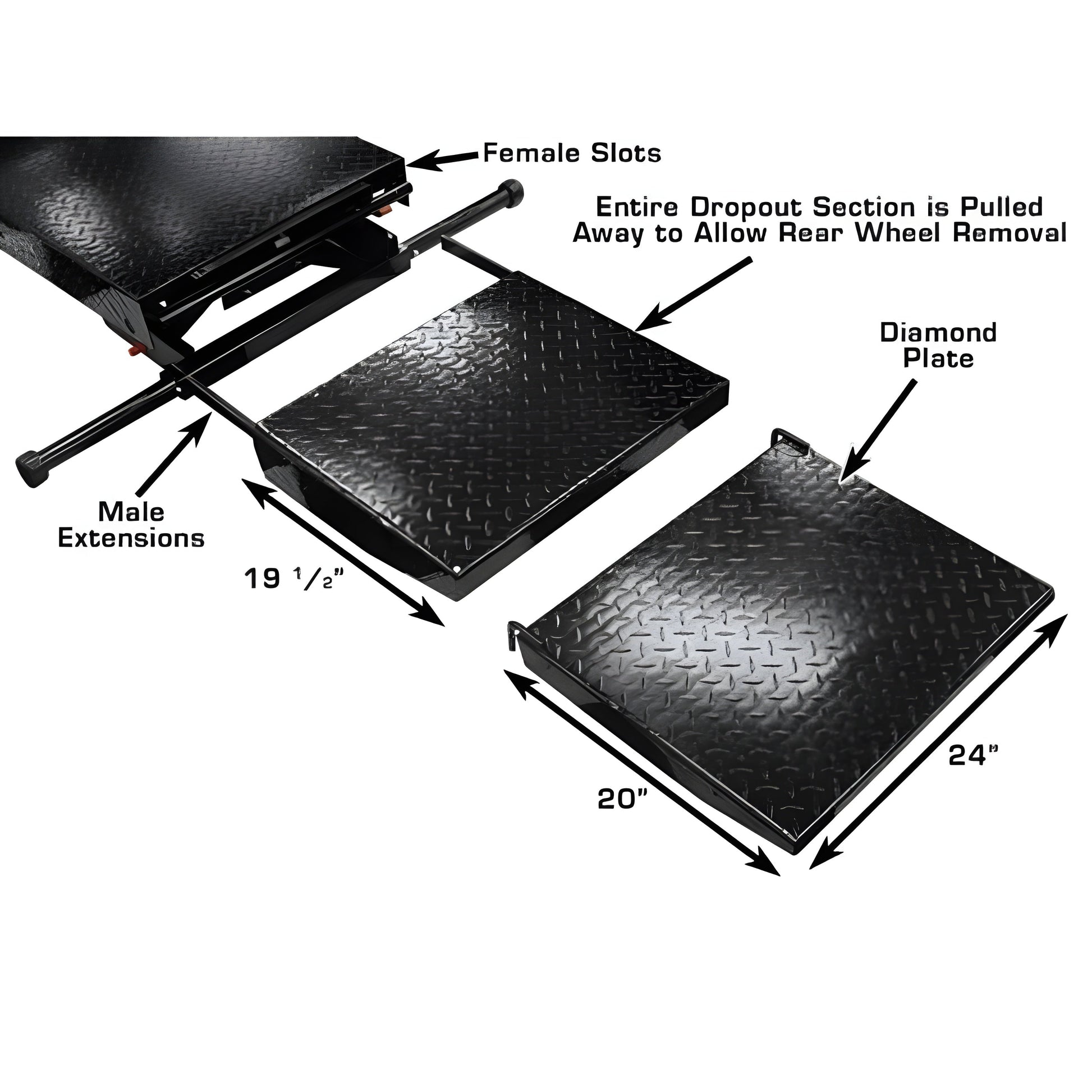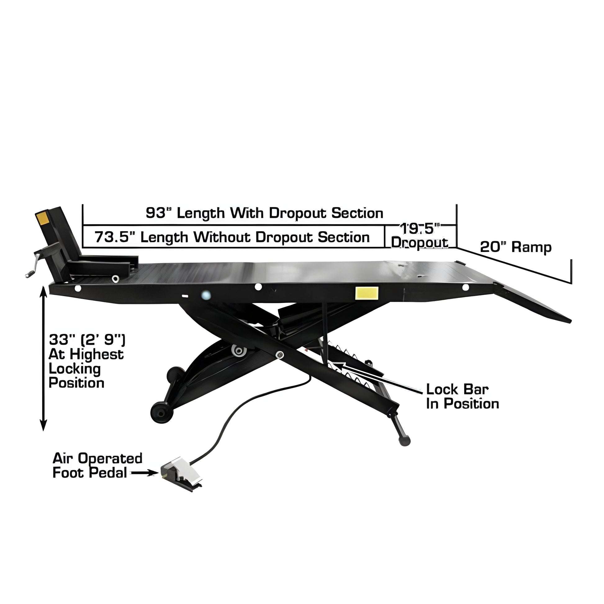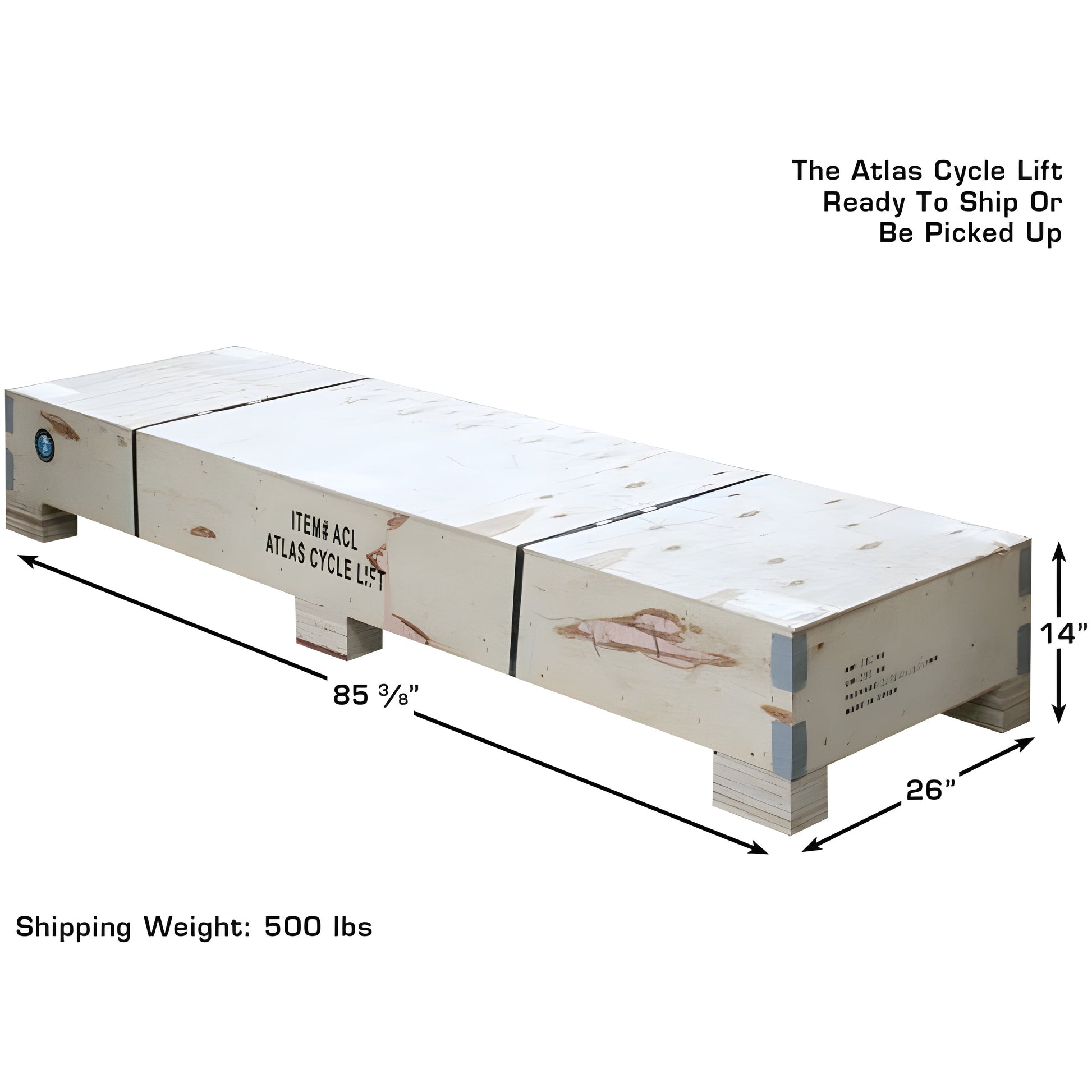 The Atlas Cyclelift has one of the industry’s longest (standard) platforms to accommodate extra long motorcycles. The motorcycle lift has a heavy gauge (diamond plated) platform length of 93 inches and an additional 20 inch removable approach ramp.The Atlas Cyclelift is air operated and requires between 90-100 PSI to operate. The Cyclelift is the perfect addition to any service department of professional motorcycle dealers or is a great motorcycle lift for the person who wants to work on his personal bike in their own garage.This is a complete motorcycle lift that includes an adjustable front (padded) wheel vise and a heavy duty air operated foot valve for easy raising and lowering. The stabilizing bar is included at no extra charge. This bar provides greater stability for the raised platform by increasing the “footprint” of the lift. Many companies do not include this very important stabilizing bar in their “lift package”.The Atlas Cyclelift motorcycle lift comes standard with a 19 1/2″ removable rear section. This 19 1/2″ section can be easily removed so that a rear tire can be “dropped straight down” from the rear axle. Since the entire platform width is removed, any sized rim can be lowered from the axle.For those customers looking for more width to pick up ATV’s, UTV’s, Golf Carts, and other wider vehicles the Atlas Cyclelift can be equipped with the Atlas® Cyclelift Side Extension Kit to increase the width up to 4 feet.