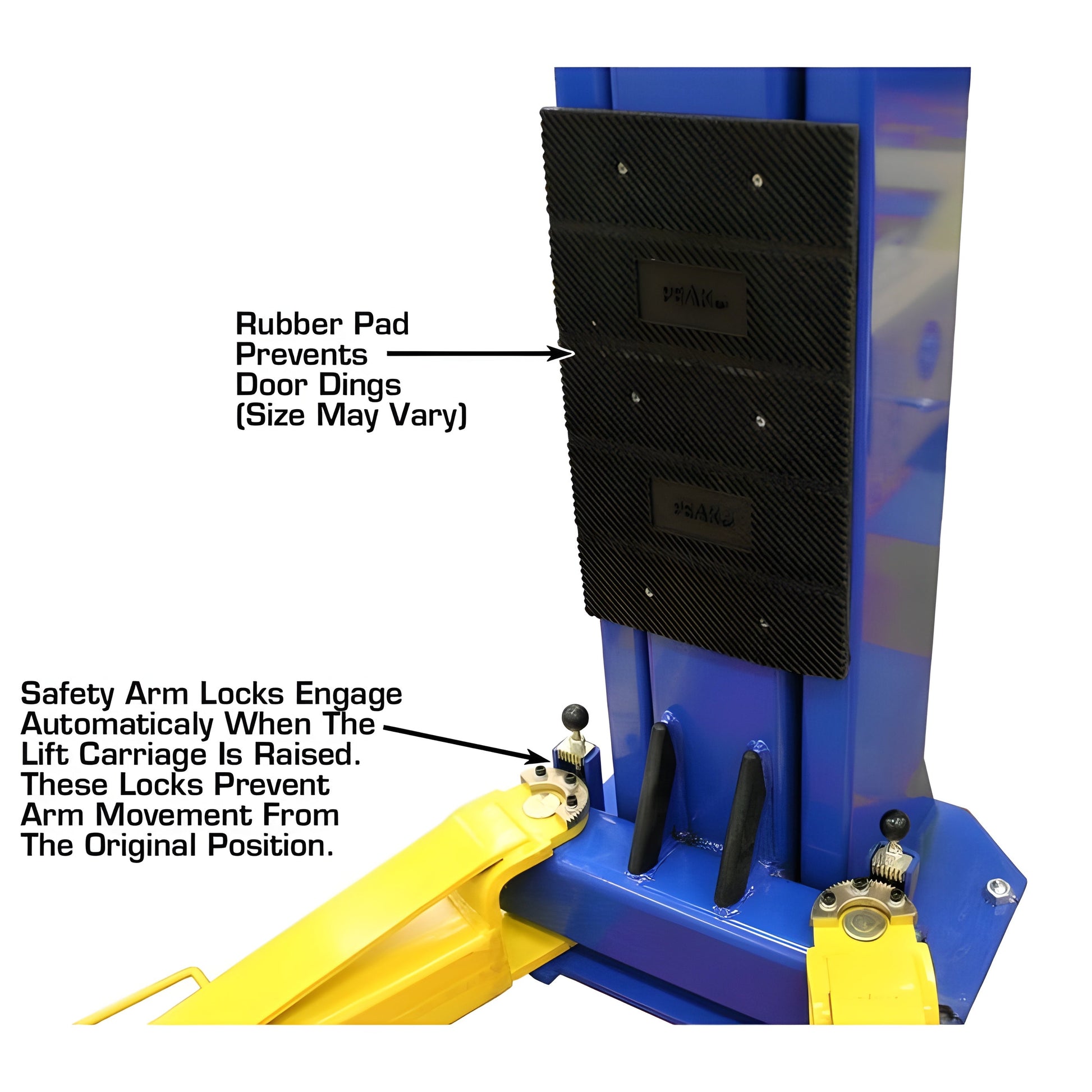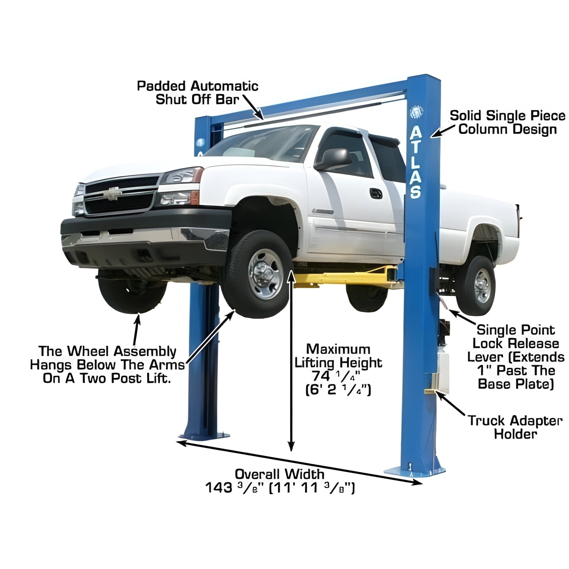 The Atlas OHX10000X two post commercial grade above ground lift is the perfect choice for those large commercial repair facilities or the “Mr. Homeowner” who demand the highest quality at the absolute best price. The Atlas® OHX10X is a TRUE 10,000 lb. capacity two post lift that offers a great value to the customer. Due to the drive through width, arm length and arm style the Atlas® OHX10000X was engineered and manufactured to lift a wide range of vehicles, specifically longer wheel based vehicles such as a one-ton diesel dually. Extra lifting height and extra width between the columns allows the operator to work on varied sizes of vehicles and offers a “fudge factor” of about 6 inches when “driving through” to another part of the building or lifting the van or “ladder truck”. If you are over 6′ 1″, the Atlas® OHX10X has longer cylinders which allow the vehicle to be “lifted” about 3 inches higher than many other lifts.The Atlas OHX10X incorporates a single piece 12′ 7″ formed column and an extra-long carriage that provides maximum column and arm strength to lift and support a 10,000 lb. vehicle. The single piece columns require the customer to have a ceiling of at least 13 feet to stand the column.