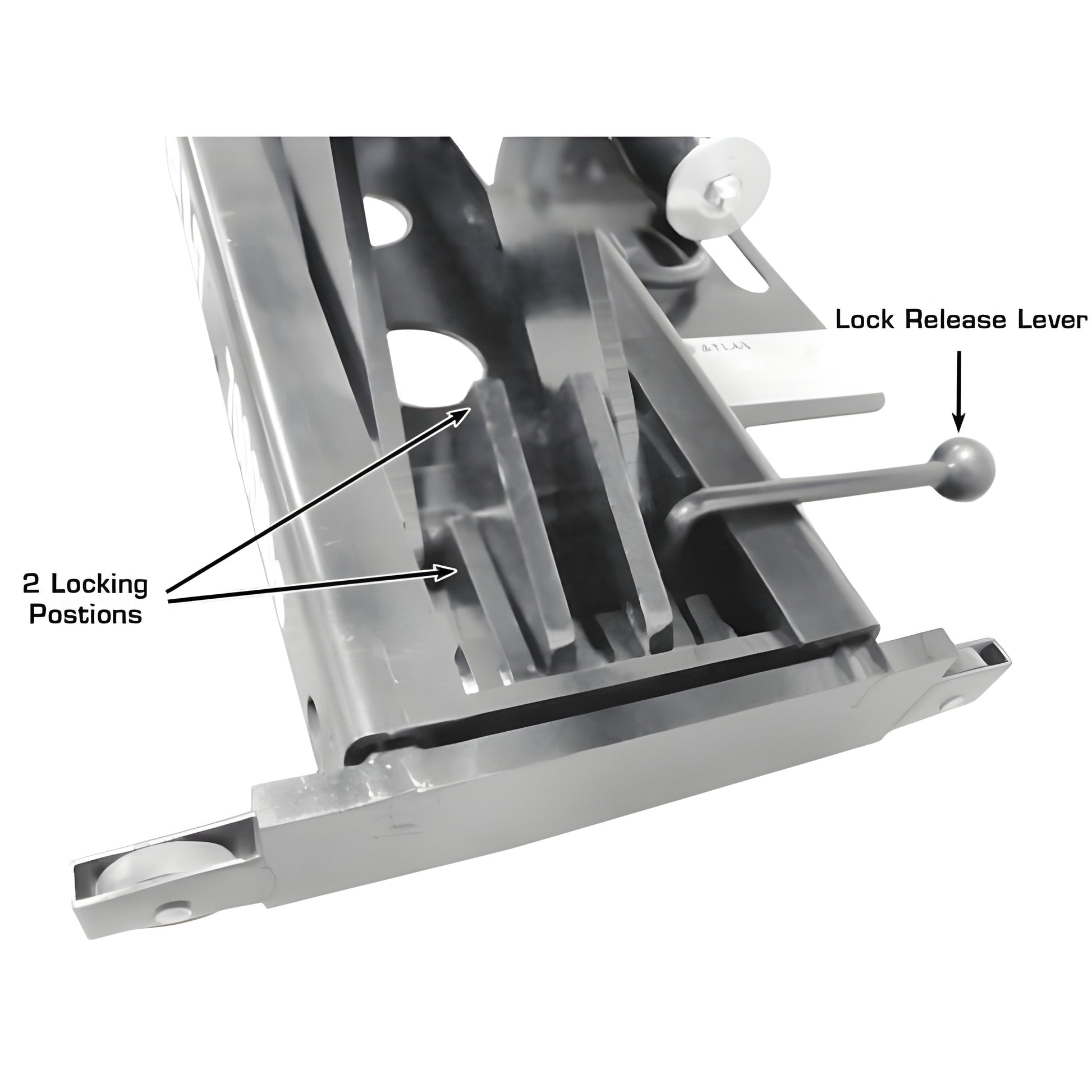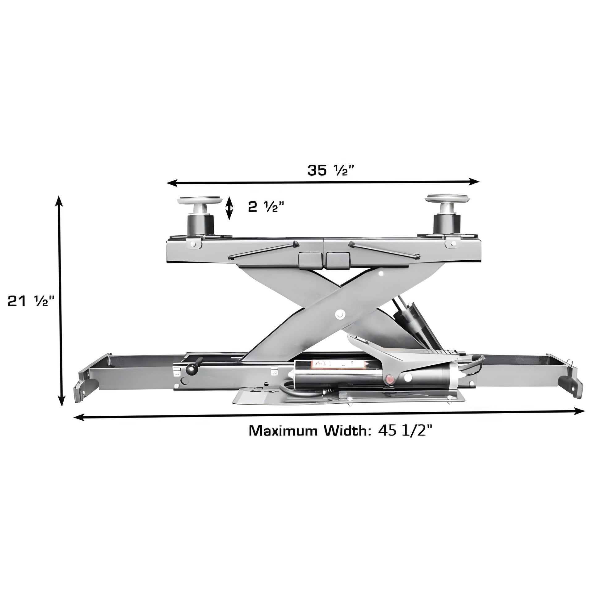 The Atlas Platinum RJ7000 air/hydraulic rolling jack has telescoping arms that can be extended over the runways of a four post lift. The lift pads at the end of these arms can be positioned under the lifting points that are located over the runways of that four post lift. This rolling jack is equipped with expandable rail supports which adjust to fit between the runways of many different four post above ground lifts. These supports have a unique roller system that allows the rolling hydraulic jack to glide easily under the entire length of the vehicle.The Atlas Platinum RJ7000 is an ALIAccessory recommended for the Atlas Platinum line of ALI 4-Post lifts.IMPORTANT: The Atlas AP-RJ7000 is designed and engineered to operate on “delivered” air pressure of between 70-115 PSI. If you exceed 115 PSI, you may damage your jack.