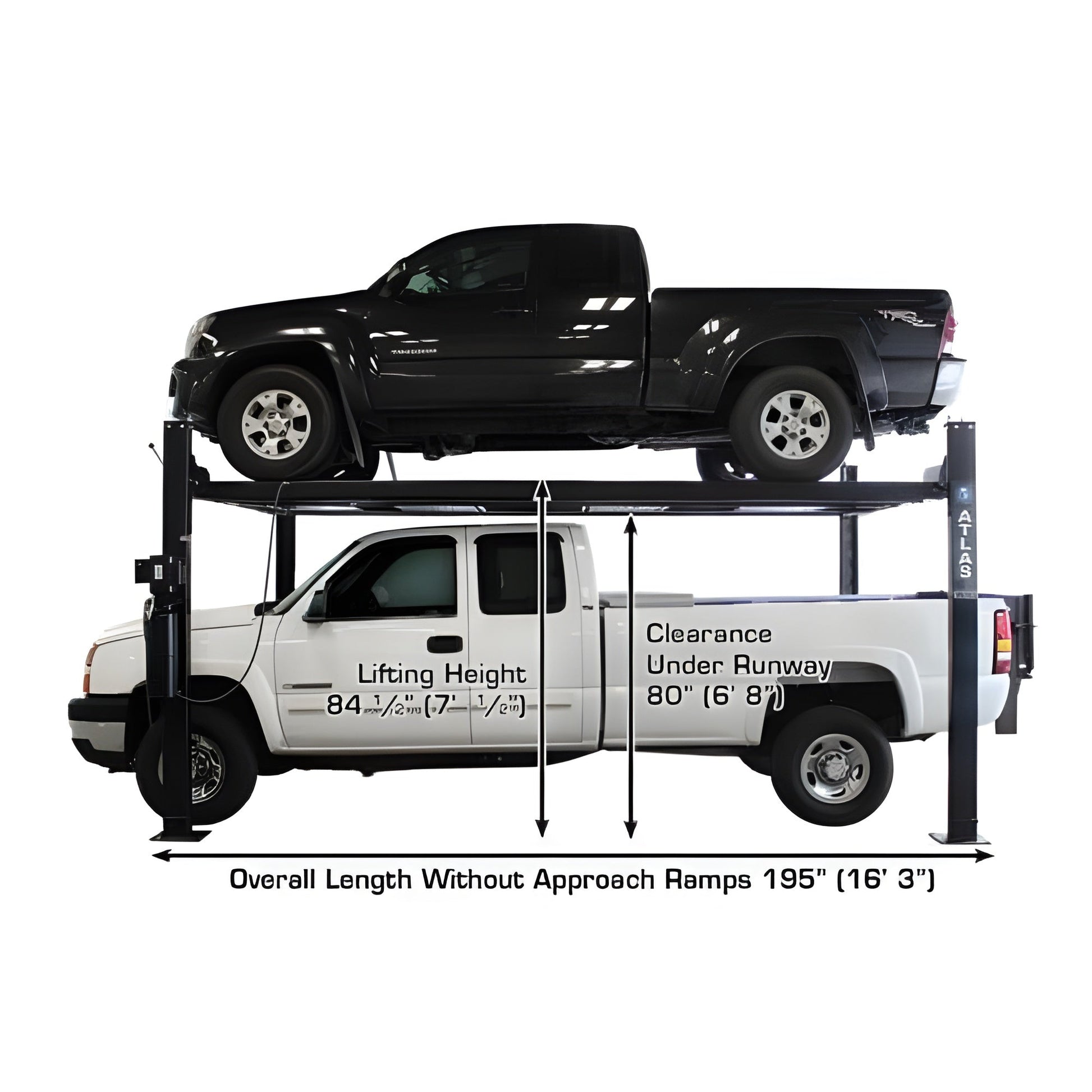 The Garage PRO8000EXT-L features the extra lifting height of the PRO8000EXT but is also 20 inches longer and 3 inches wider. Or to compare to the original, the Garage PRO8000EXT-L is 20 inches longer, 3 inches wider, and 14 inches taller than the standard Atlas Garage PRO8000! The extra runway length will accommodate almost all of the longer wheelbase pickup trucks, except duallys. This is because the dual rear wheels are TOO WIDE to fit between the column lock assemblies. Check out the Atlas Garage PRO9000 if you need a portable lift for your dually!This combo package also includes two of the popular Atlas RJ35 sliding bridge jacks. The jacks are perfect for raising a vehicles wheels off the lifts runways in order to service tires and brakes.