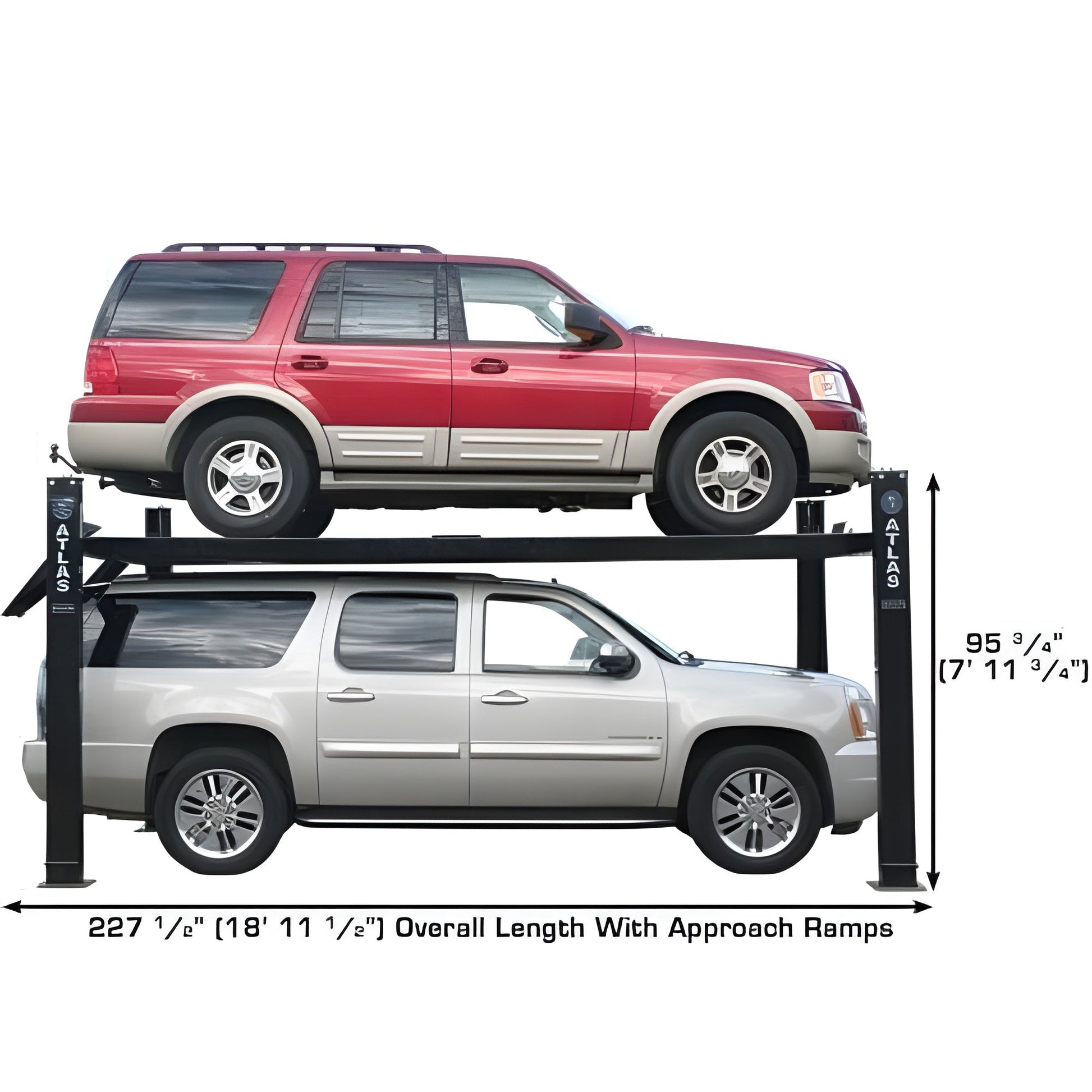 The Atlas Garage PRO9000 4 post lift is a heavy-duty hobbyist lift and features the highest lifting capacity of all our Garage PRO series lifts. The Garage PRO9000 is extra-long and has the longest runways (we believe) of any portable 9,000 LB. four post on the market. That feature allows the lift to handle some of the longest wheelbase vehicles out there. The Garage PRO9000 is extra wide allowing even Diesel Duallys to be driven onto the runways. This lift also features extra height so everything from Smart Cars to a Dually can be parked both below and on the runways.The commercial grade features of the Garage Pro 9000 make this lift the perfect choice for automotive service center or βMr. Homeownerβ that needs a PORTABLE professional four post lift at a competitive price.This combo package also includes two of the popular Atlas RJ35 sliding bridge jacks. The jacks are perfect for raising a vehicles wheels off the lifts runways in order to service tires and brakes.