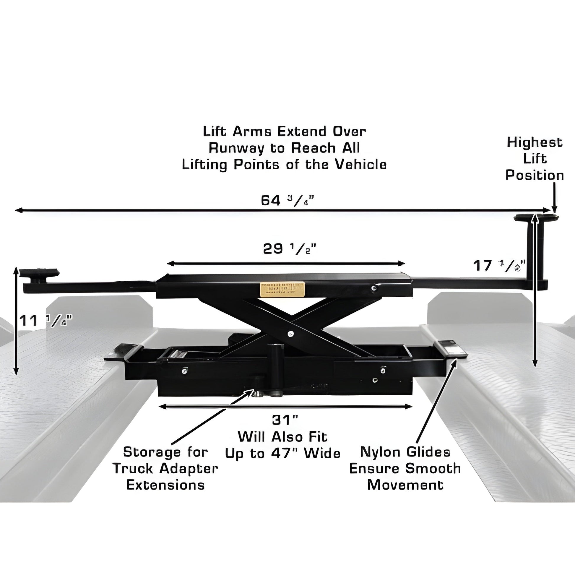 The Atlas RJ35 (3500 LB. capacity) sliding hydraulic bridge jack is the perfect choice for the owner of the Atlas Garage PRO8000 or any of our other Atlas Garage Pro lifts. The RJ35 Sliding Jack will also work on our other hobbyist four post lifts such as the ALI Certified Atlas APEX8 and APEX9 as well as the Premium Atlas 408SL and 409HP. The RJ35 Sliding Jack is perfect for those who want to perform wheel service on a vehicle that is positioned on top of their four post lift.Most four post hobbyist lifts come with a jack tray. The jack tray has certain limitations that are eliminated by using the Atlas® RJ35 Sliding Jack. The jack tray (with a small floor jack or jack stands) will support ONLY THOSE LIFTING POINTS of the raised vehicle that are between the runways of the four post lift. The RJ35 Sliding Jack has telescoping arms that can be extended over the runways of the four post lift. The lift pads at the end of these arms can be positioned under the LIFTING POINTS (that are located over the runways of the four post lift) of the vehicle allowing the operator to access many more LIFTING POINTS than just using the jack tray.The Atlas RJ35 Sliding Jack comes standard with a set of peg style truck adapters which increase the lifting height of the lift pads. These truck adapters will allow the RJ35 Sliding Jack sliding hydraulic jack to raise pick up trucks that will sit higher on the runways than the average passenger car. The RJ35 Sliding Jack is operated by a manual hydraulic pump (porta-power pump) and does not require an air compressor for power. This jack also features two solid locking positions that are used when the vehicle is to be suspended above the runways. When the locking positions of the Atlas RJ35 Sliding Jack are engaged, the hydraulic pressure from the lifting cylinder of the jack is eliminated. (These locks act much like a pair of jack stands after you lift a vehicle off the ground with a service jack).