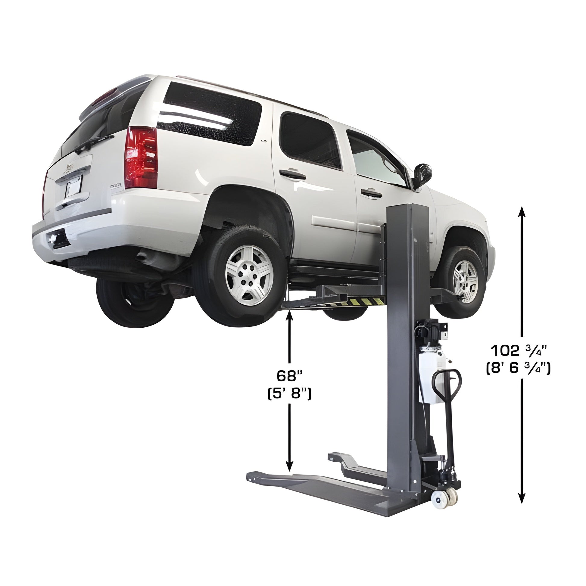 The Atlas PSP-6000 portable single post lift is the perfect choice for the commercial service shop or the Mr. Homeowner who does not want to tie up a bay space with a permanently mounted above ground lift. This portable vehicle lift allows the operator to walk under the vehicle or move around the vehicle to perform wheel service. When the Atlas PSP-6000 is not in use, it may be rolled out of the way into a corner. The PSP-6000 also has a built-in ramp allowing vehicles to drive over it, further maximizing garage space.The Portable Single Post Lift rolls easily on a level concrete surface and can be used either inside or outside of your garage. The column fits under a 9 foot (108 inch) ceiling and allows the operator to raise most vehicles high enough to access many parts of the vehicle that would not be accessible with a mid-rise lift.The Atlas PSP-6000 column is equipped with the chain break mechanism that automatically locks the carriage into place in the unlikely event of a chain failure.