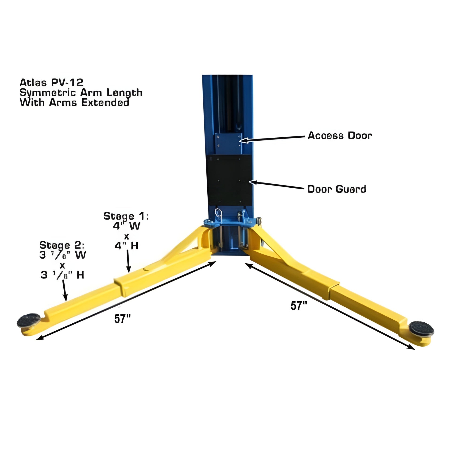 The Atlas PV series represents the absolute best value for the customer who demands a heavy-duty professional grade two post lift at the lowest possible price. Atlas has been manufacturing the PV series two post above ground lifts for over a decade. Thousands sold! Descriptions such as “bulletproof”, built like a brick outhouse, tougher than nails, and other such euphemistic phrases are used every day to describe any of the Atlas® PV series models.The Atlas PV12PX is a commercial grade lift designed to accommodate both long wheel-base trucks and because of a low pad height, passenger cars. The distance between the symmetrical columns is 123″ with a drive through space of 109″. The extra distance between the symmetrical columns will allow the widest of vehicles or vehicles with wide rearview mirrors to be lifted or driven through. The increased length of the symmetrical arms coupled with the additional height of the included peg style truck adapter set allows the operator to safely raise long wheel-base trucks with a variety of running boards. The extra height means extra clearance allowing you to lift vans and box trucks without worry.The Atlas ATEXH-PV12PX features three height settings, the lowest setting of 150 inches or 12 foot 6 inches requires the purchase of extra short cables.