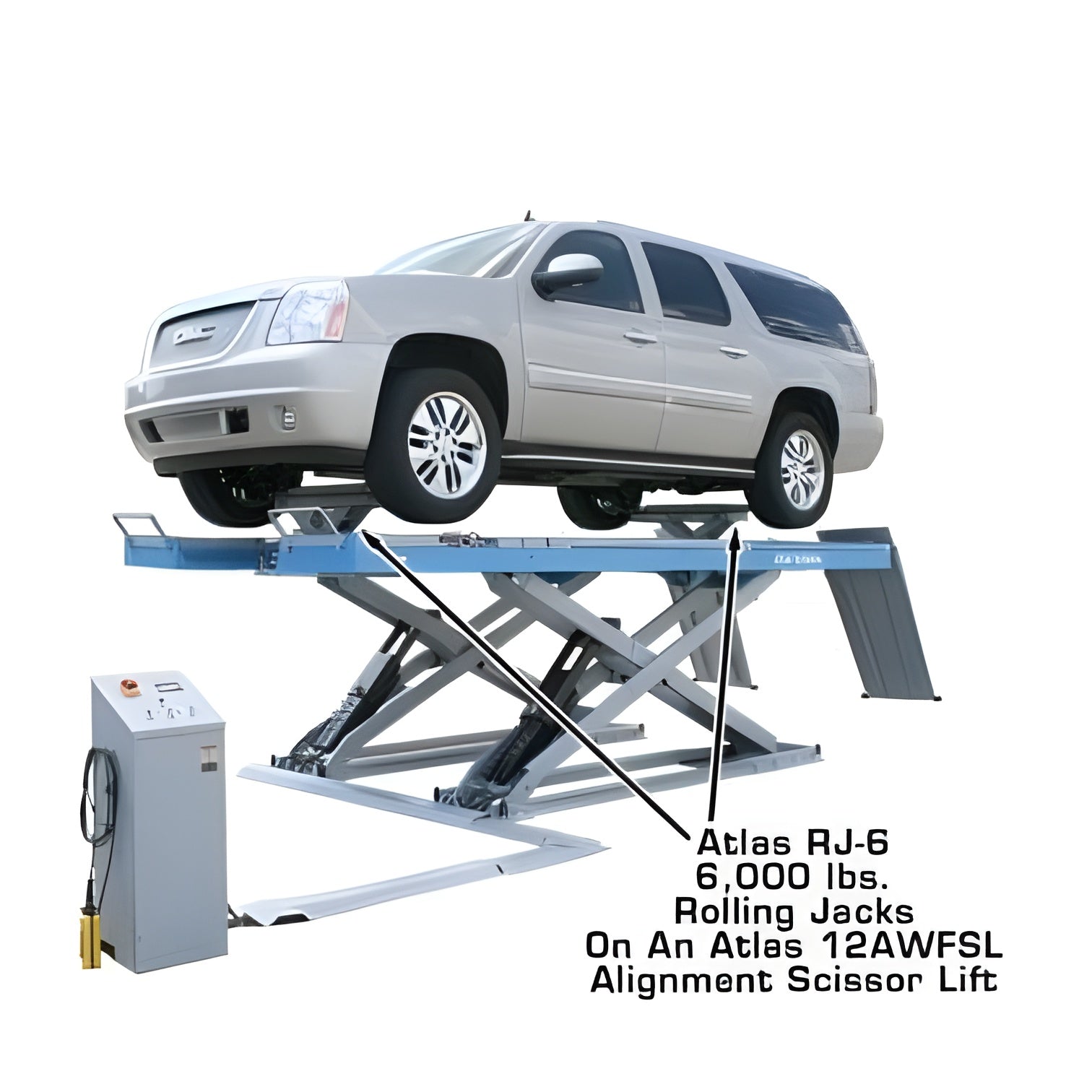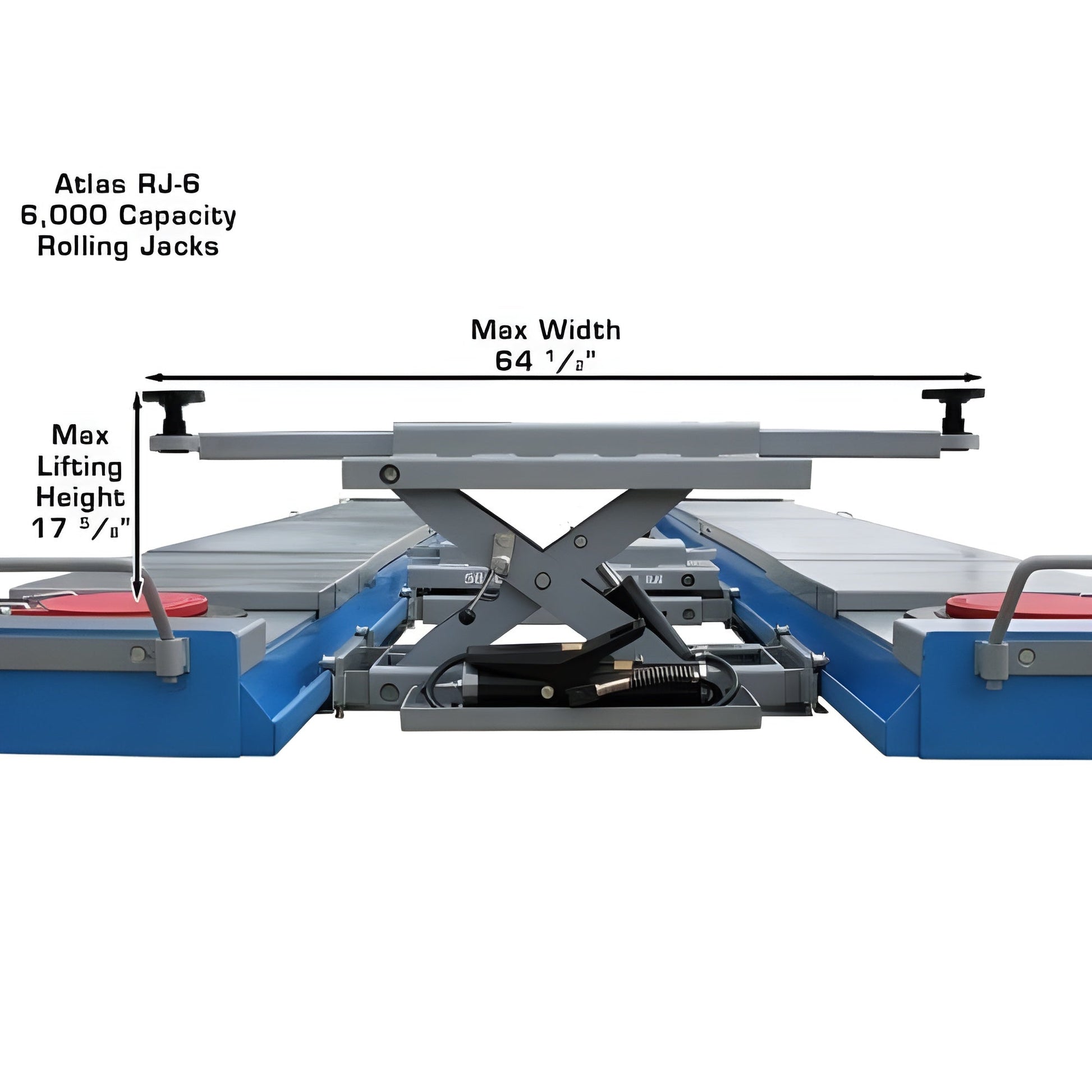 A: The Atlas RJ-6 is a rolling bridge jack designed for use with 4-post lifts, allowing for wheel-free lifting to perform tire, brake, and suspension work on vehicles up to 6,000 lbs.