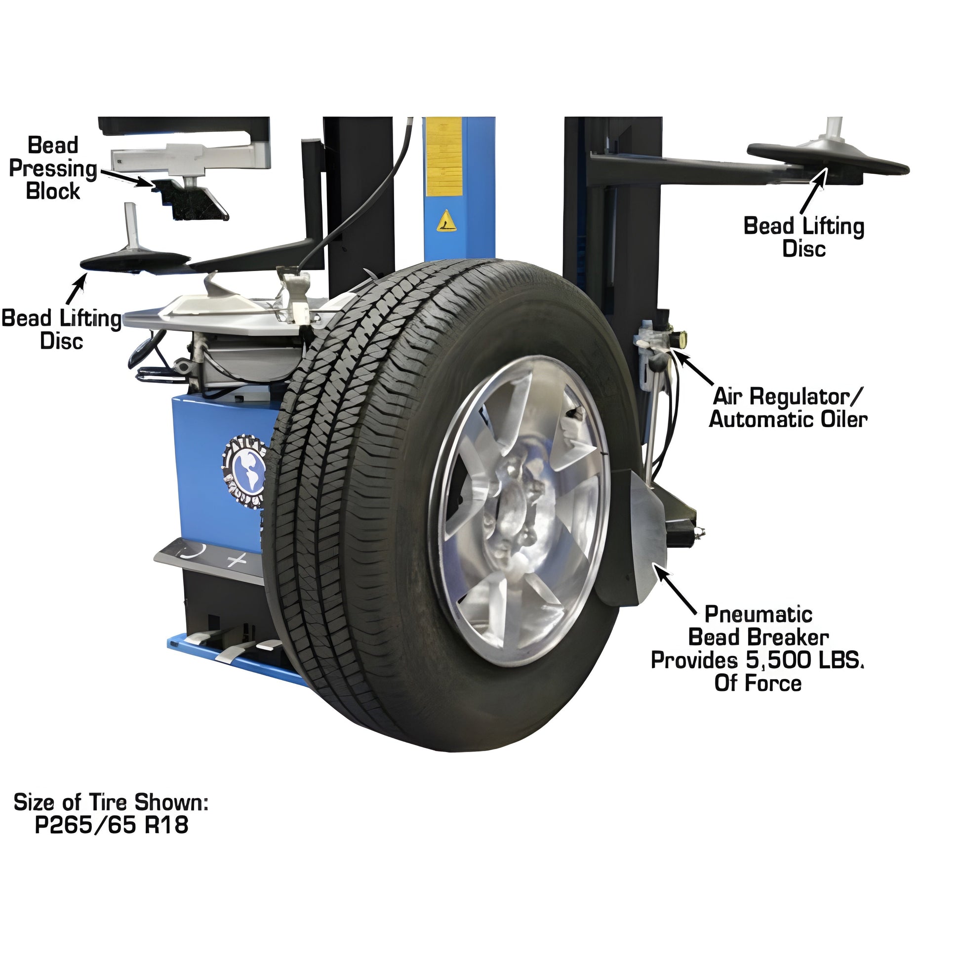 Advanced Tire Changing with Dual Assist Arms – The TC289DAA's dual assist arms provide extra control when working with large rims, making tire changes faster and more precise, reducing technician strain and improving accuracy.