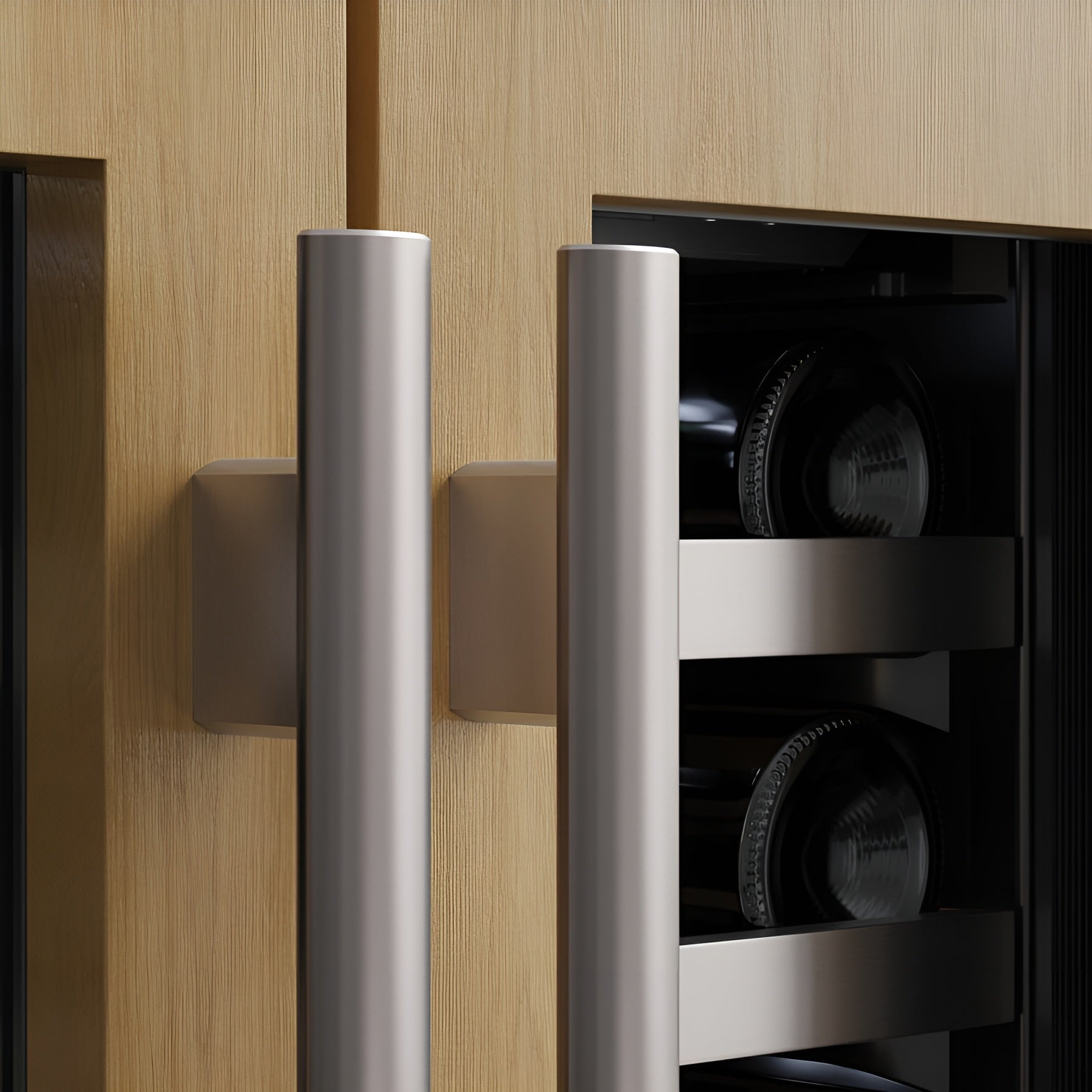 A: A 24-inch wide wine cooler with a 42-bottle capacity, featuring French doors, LED lighting, and an elegant design. This cooler offers optimal storage for your wine collection, with a sleek appearance that fits seamlessly in any space.