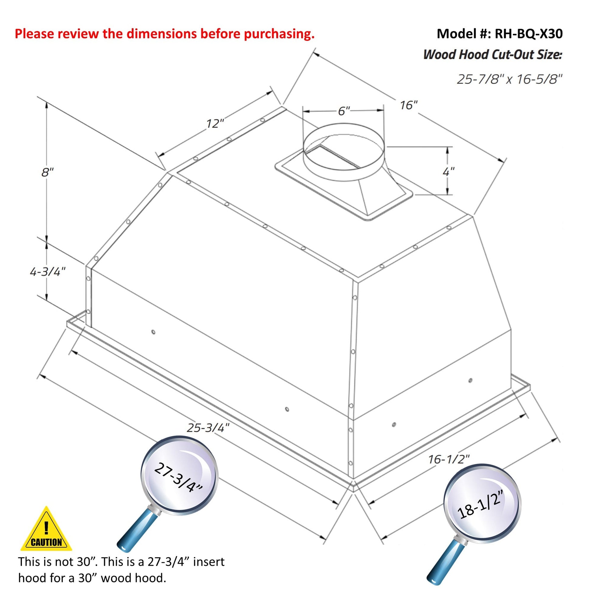 - 30" Hood Dimensions: 27-3/4"W x 18-1/2"D x 17-1/4"H. Hood weight: 37 lbs. Wood hood cut out hole size: 25-7/8" x 16-5/8".