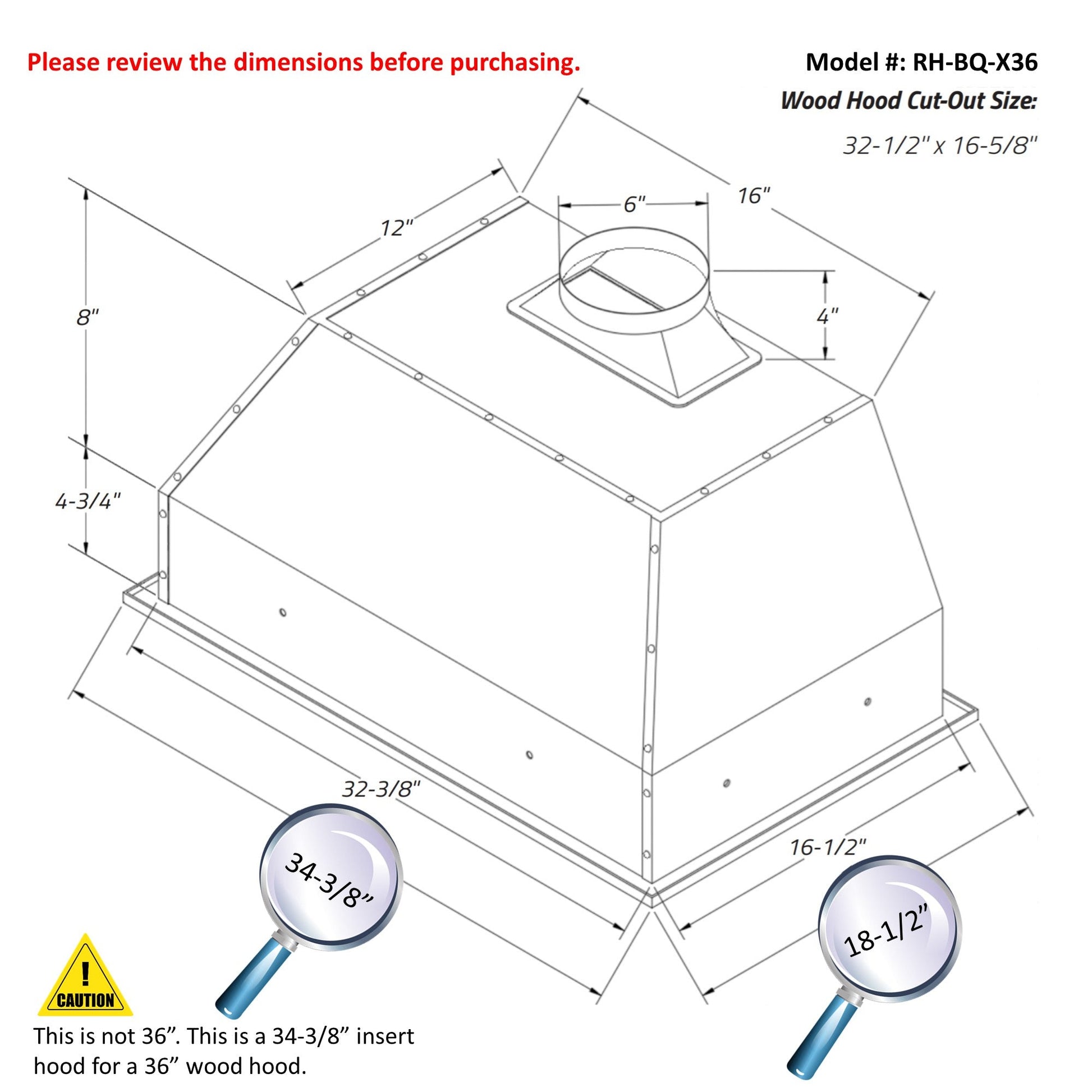 36" Hood Dimensions: 34-3/8"W x 18-1/2"D x 17-1/4"H. Hood weight: 39.5 lbs. Wood hood cut out hole size: 32-1/2" x 16-5/8".