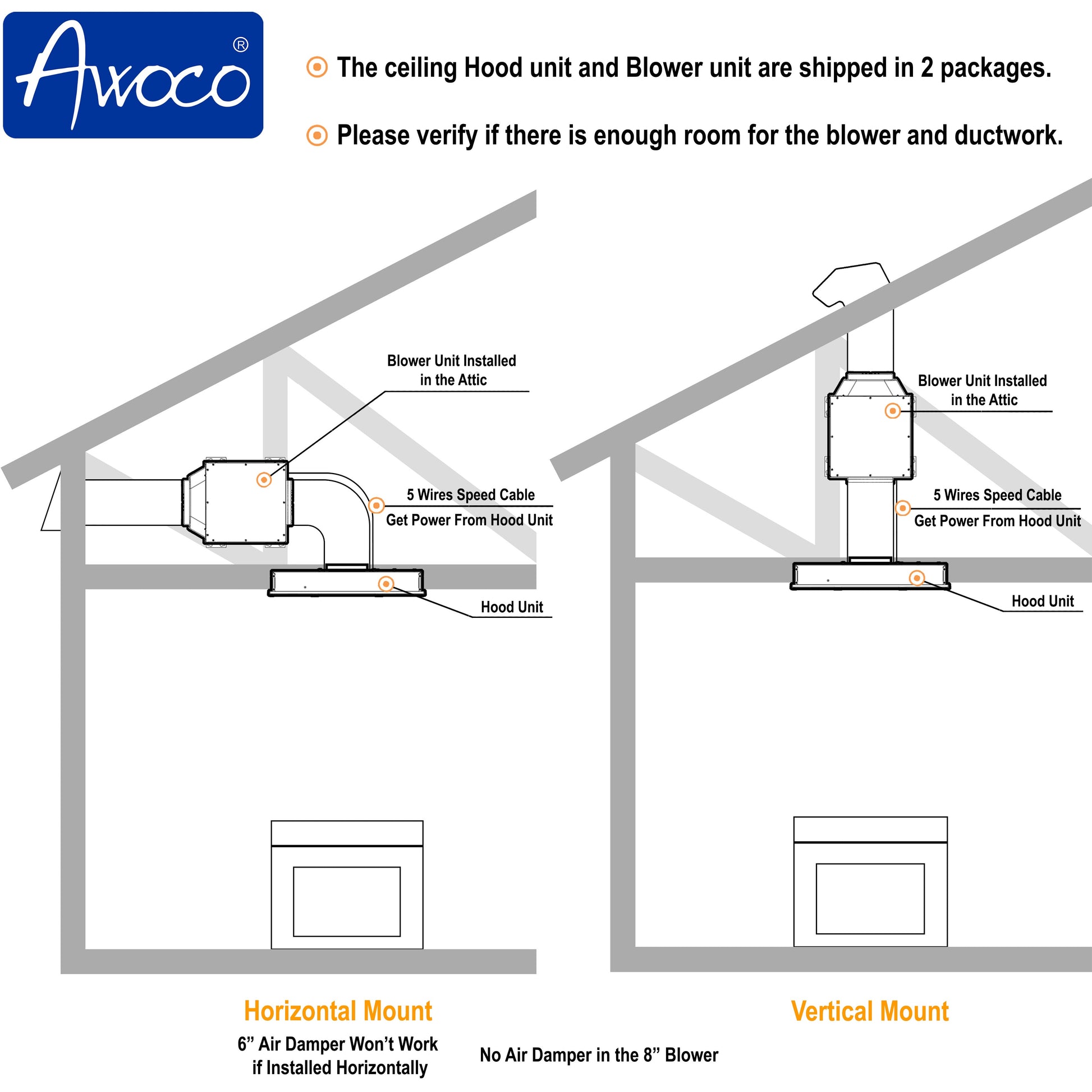 Awoco RH-IT06-R Ceiling Mount 14-1/2”D Super Quiet Split Stainless Steel Range Hood, 4-Speed, 800 CFM, Mesh Filters, Remote Control with 6” Blower - RH-IT06-R30-COLD