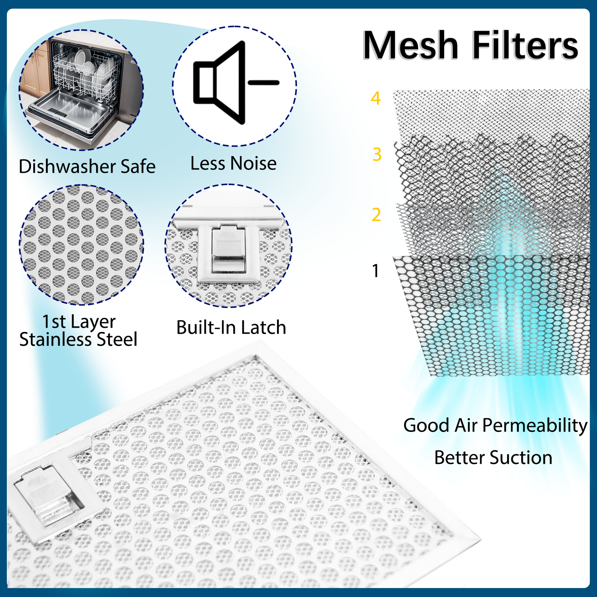 DISHWASHER SAFE MESH FILTERS: 4 layers dishwasher safe commercial style stainless steel/aluminum mesh filters with built-in latch. Stainless steel for the 1st layer and aluminum for the remaining 3 layers, which provide good air permeability, better suction, and less noise compared to baffle filters. The oil is contained in the mesh filters; no oil holders are needed.