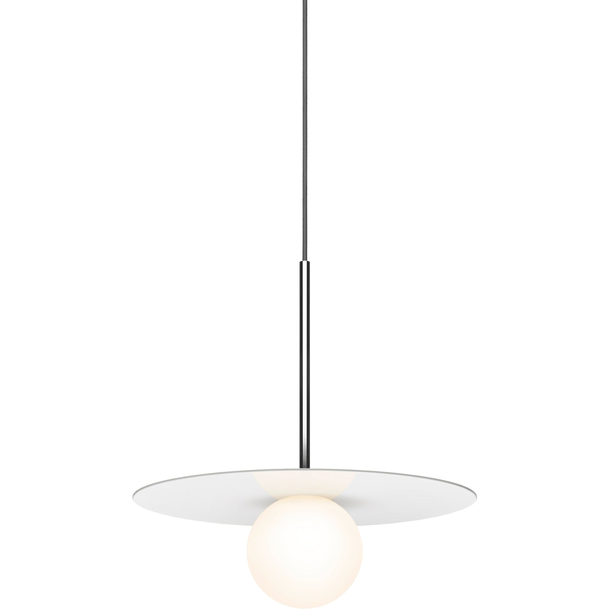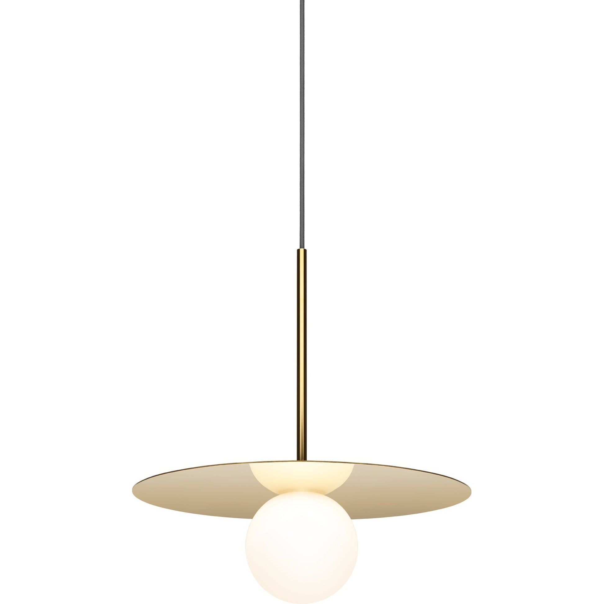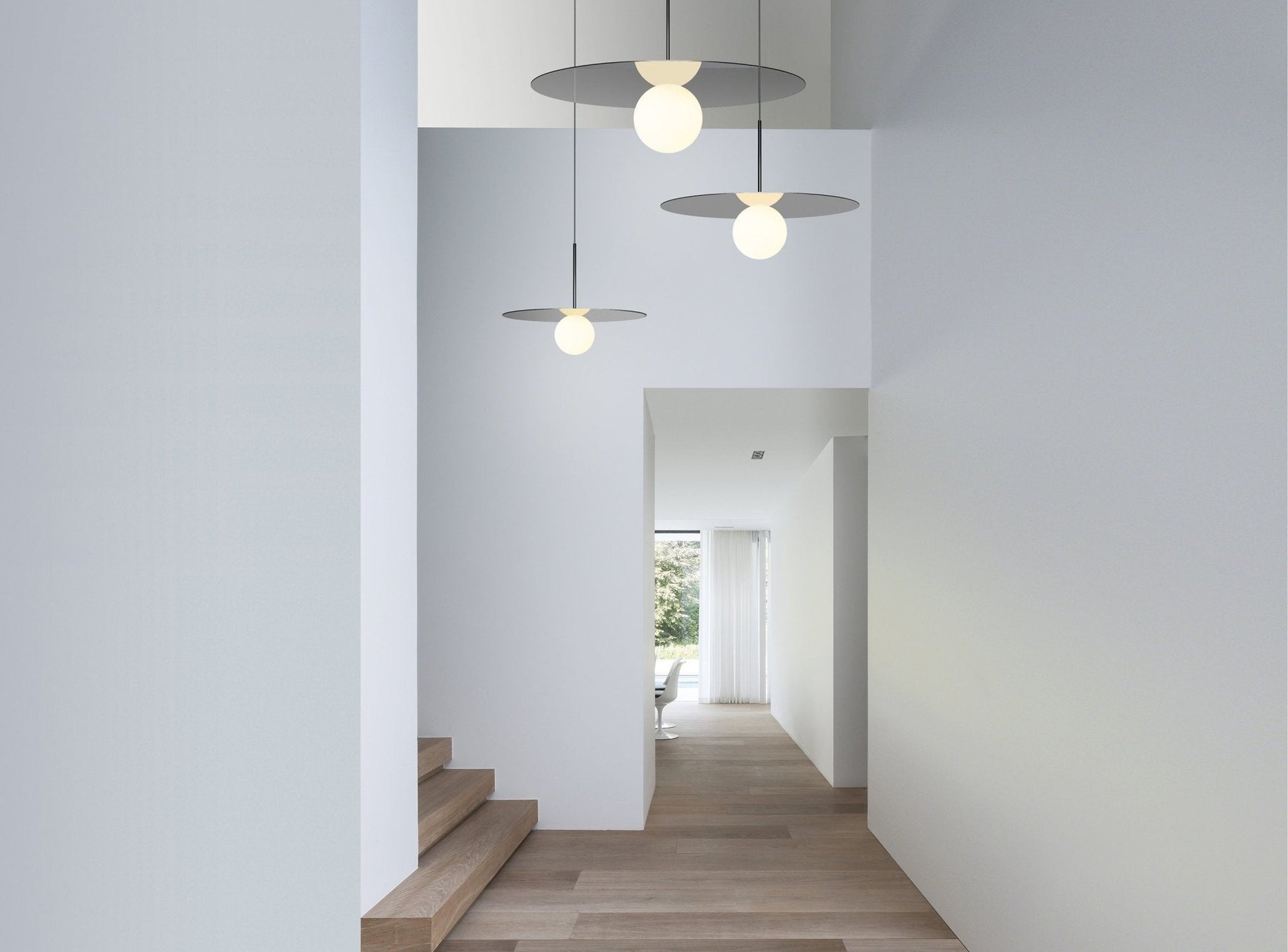 The Bola Disc Pendant by Pablo Designs brings effortless elegance to any room. With an opal glass globe that softly glows and a polished disc reflecting its surroundings, the pendant creates a calming ambiance. Available in four sizes—12", 18", 22", and 32"—it is perfect for a round coffee table or media console. Additionally, suspending multiple pendants together creates a dramatic, modern chandelier effect.