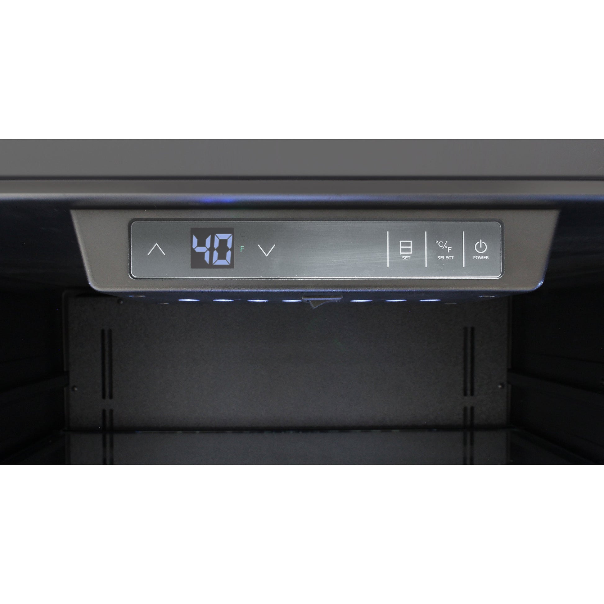 The Brama 300-Series Pantry Refrigerator features a sleek black cabinet body and door with a pole handle that makes this unit a great addition to any pantry or garage setting. Beautiful enough to place inside the home, we designed this refrigerator with added insulation to be able to be used out of sight as well. With special insulation in both the cabinet and the door, it can withstand the higher temperature changes in warmer or colder climates. With a single temperature zone, this unit is perfect for storing beverages at the right temperature. The glass shelves are designed for storage display inside the unit. The internal digital control panel makes setting the perfect temperature simple and enables you to store all of your goods under the exact same conditions. You can also turn the interior blue LED lighting on or off with a switch of a button. A front exhaust makes it simple to build this refrigerator into existing cabinetry of a garage, or it can also be used freestanding. Shelves can be adjusted to store various items in multiple configurations. Side-by-side installation with EL-300GFEB-L Garage Dual-Zone Wine Cooler (Left Hinge) gives you a left and right setting with matching wine cooler and refrigerator for your garage or pantry. Covered by the Vinotemp One-Year Limited Warranty.