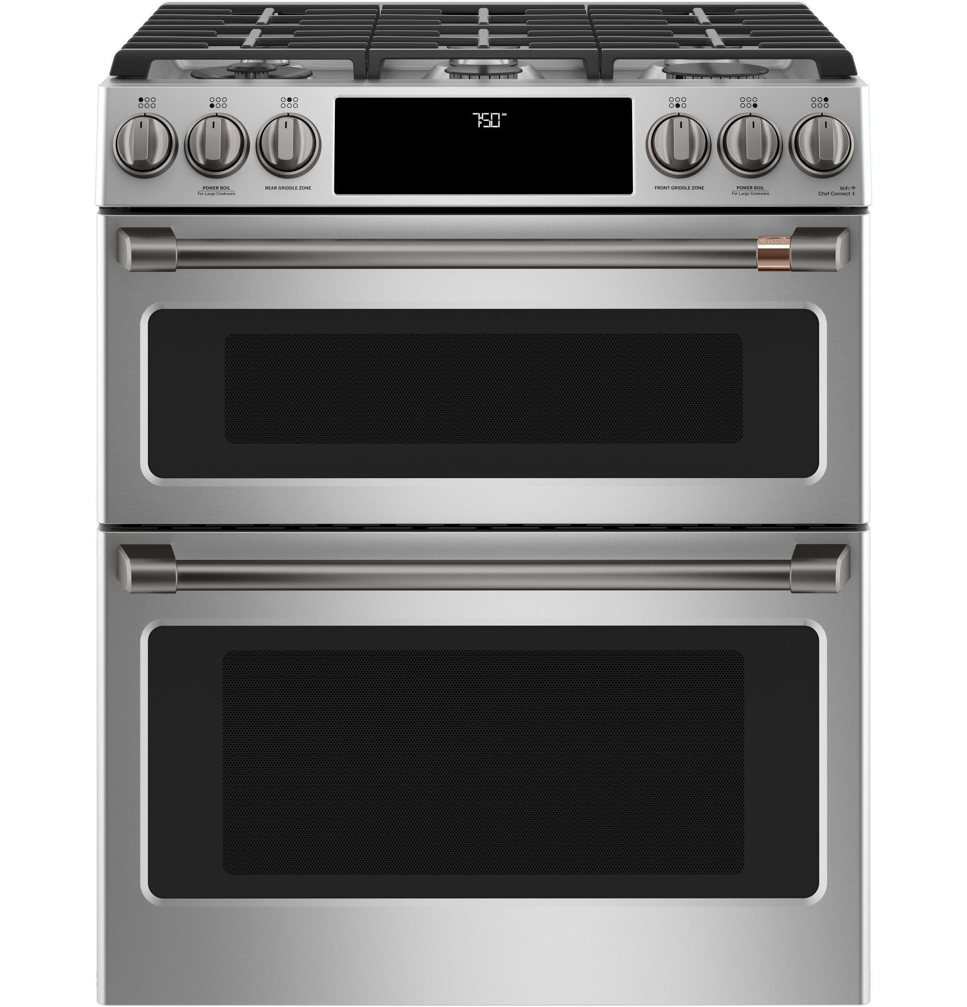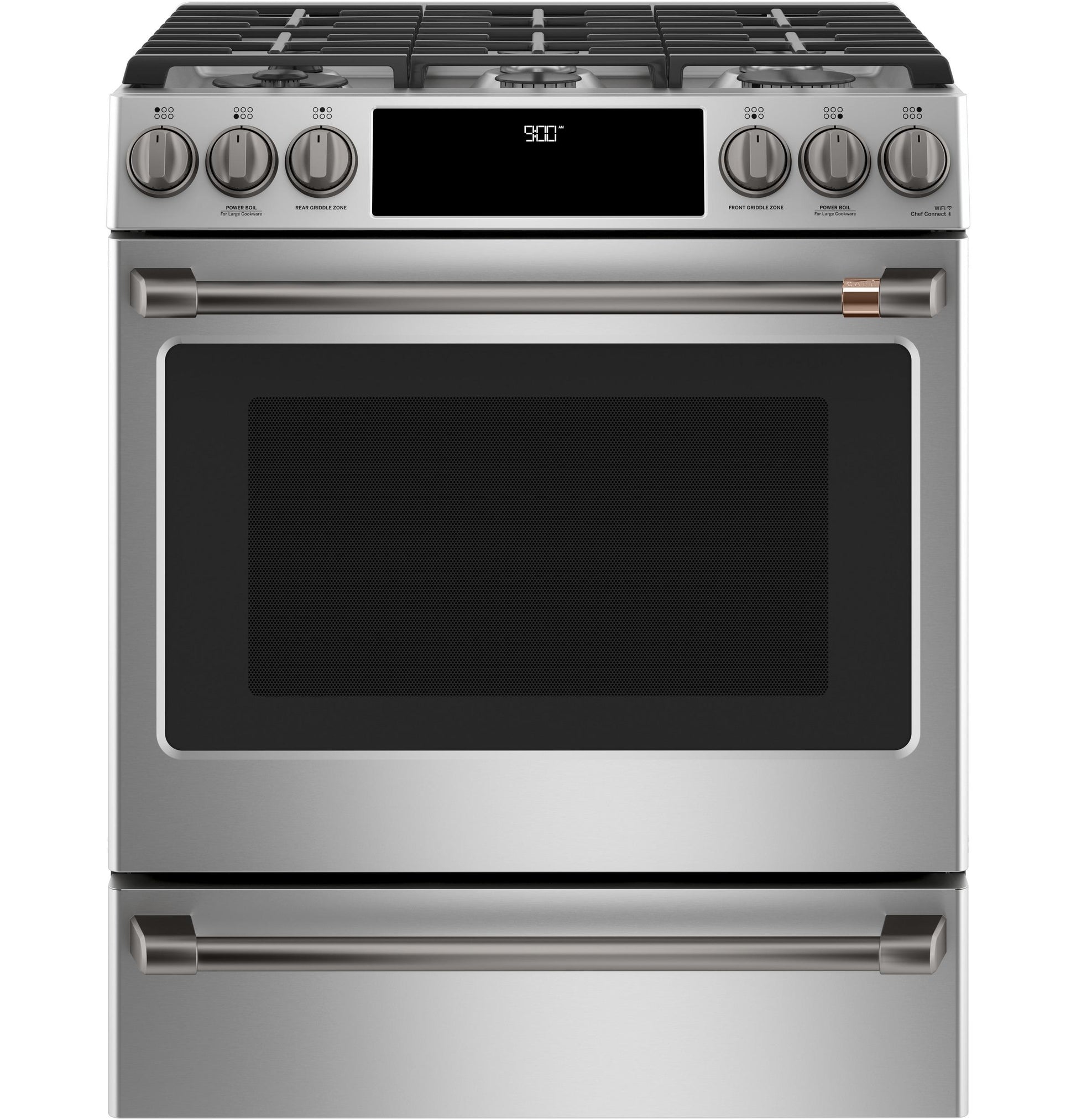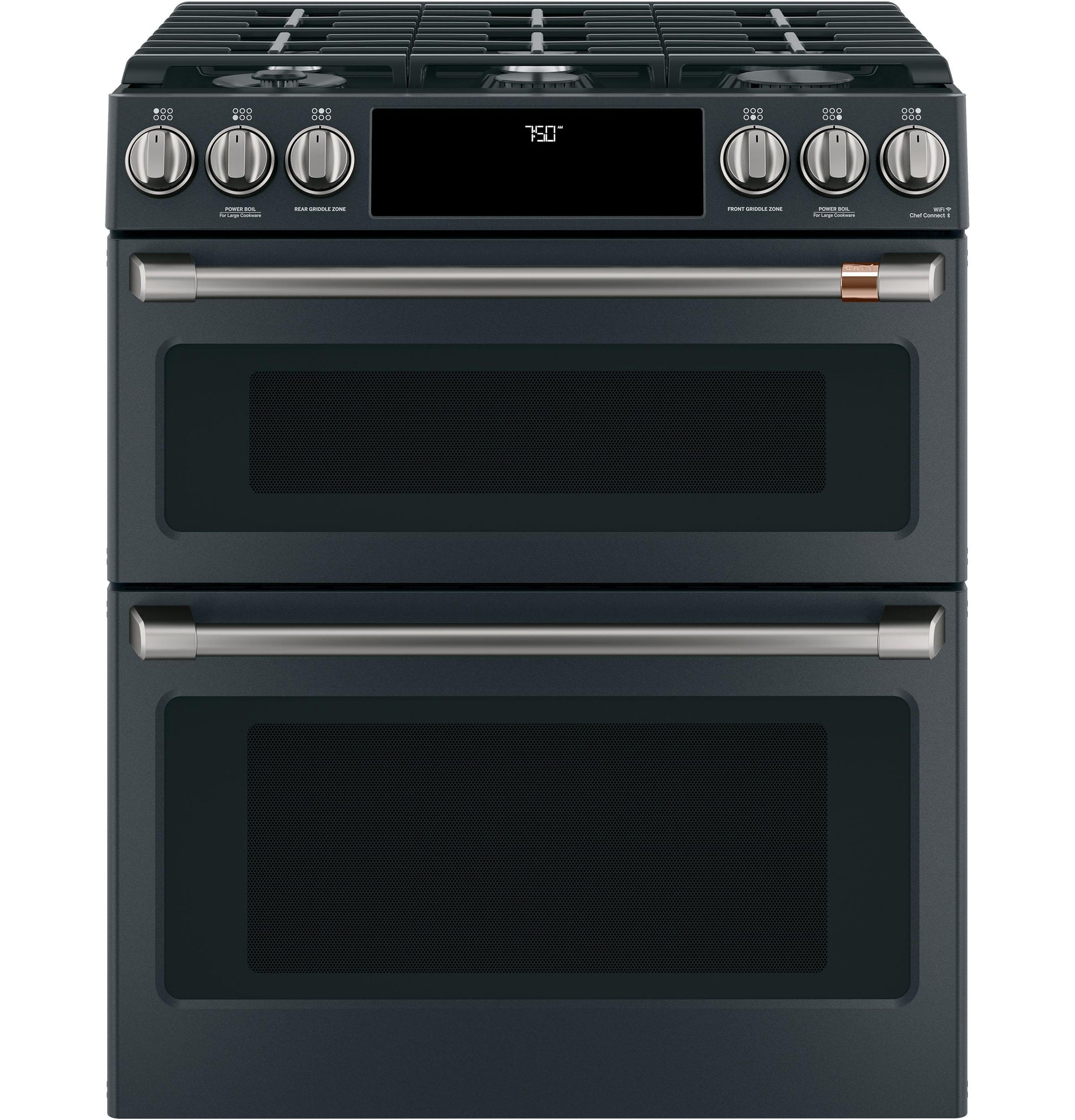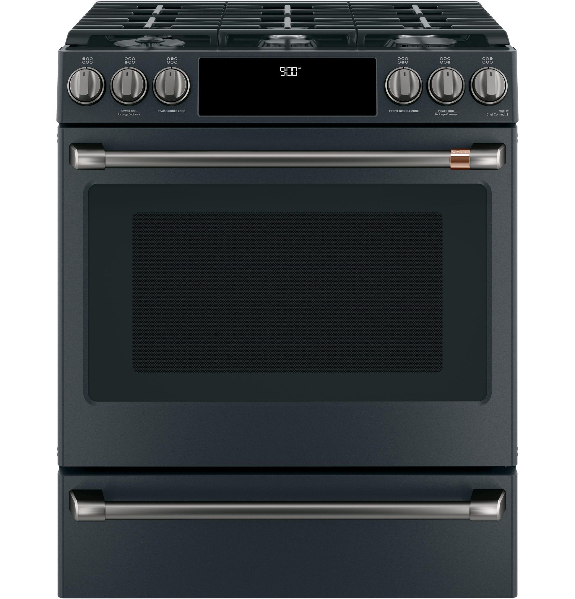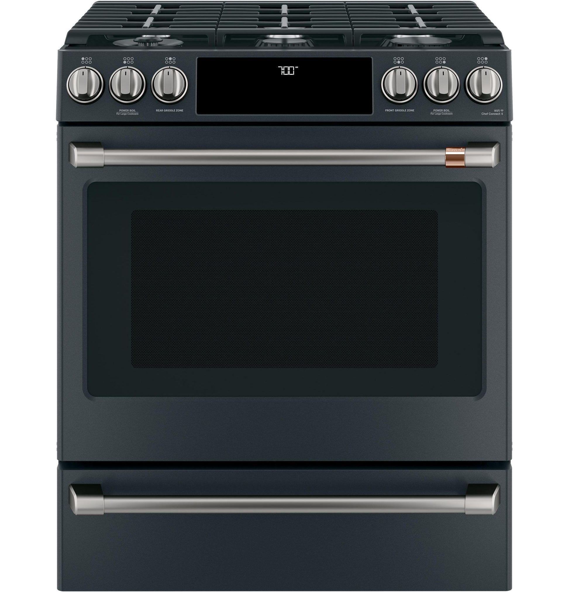 Brushed black finish adds a sleek, modern accent to your CAFE gas range.
