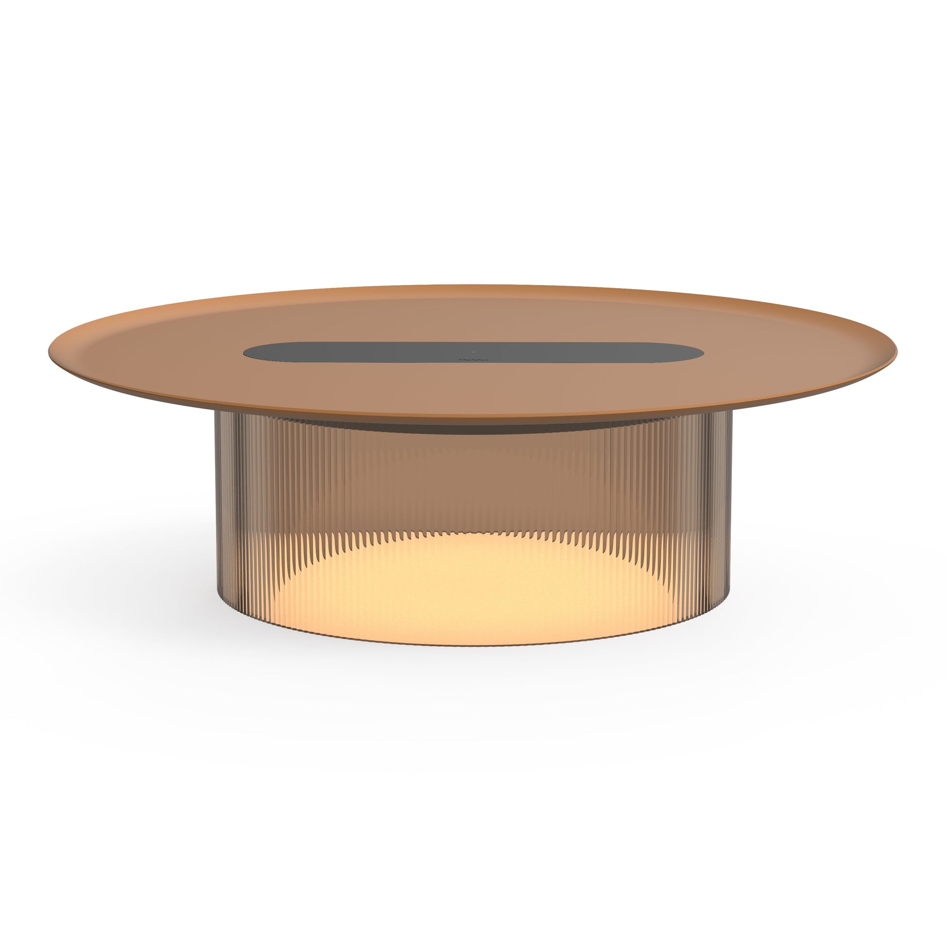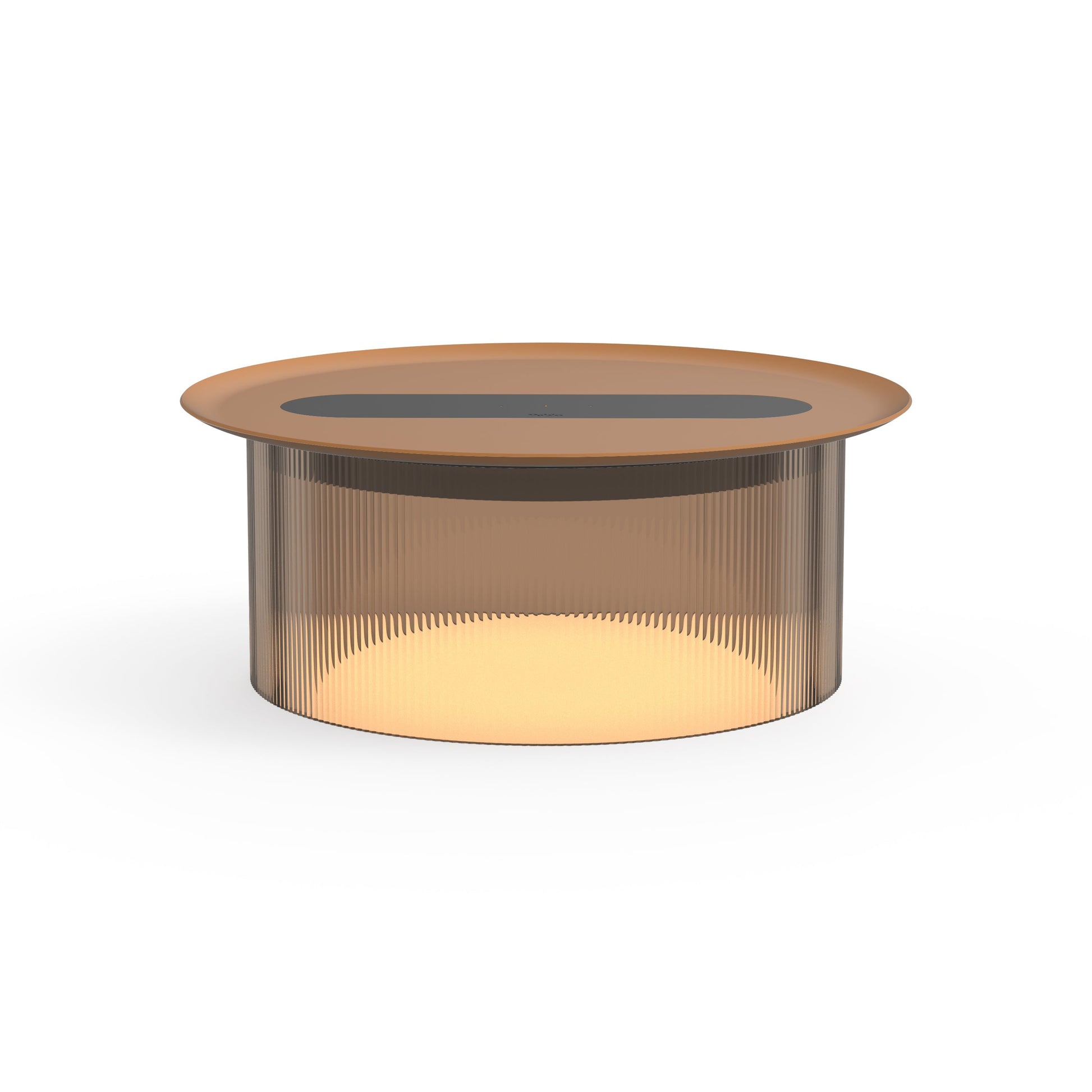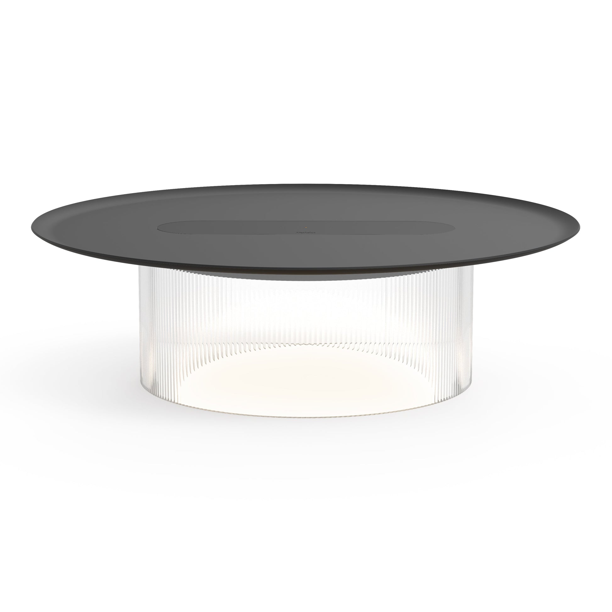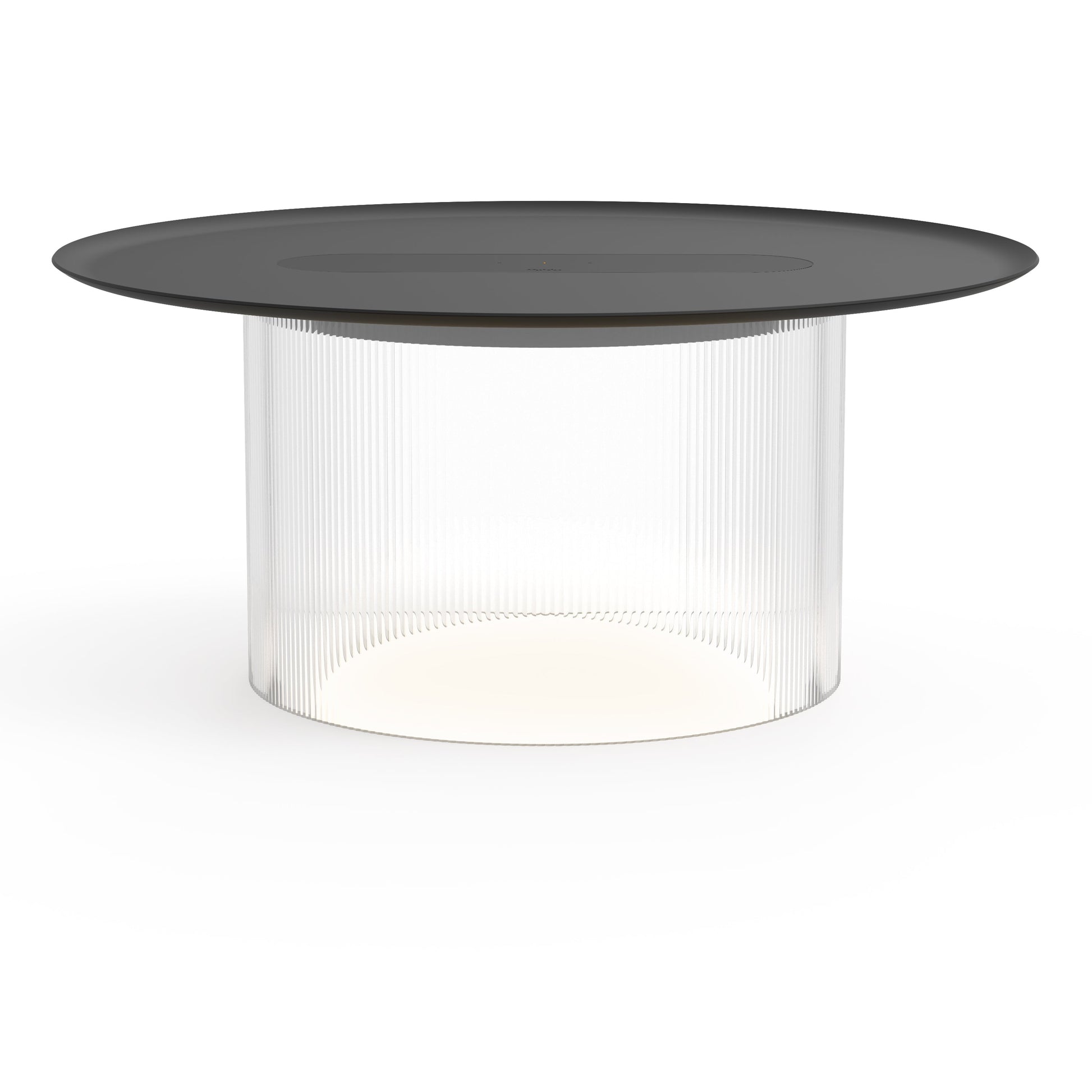 Carousel blurs the line between ambiance and utility combining a low setting wireless charging tray surface for your mobile devices with warm, glare-free illumination. It's low profile LED light module is discreetly concealed below its mating tray and suspended atop a transparent fluted acrylic cylinder diffuser that radiates mesmerizing light patterns onto the table surface below. Perfectly suited for desktop or bedside use, Carousel embodies a uniquely hybrid perspective on what a personal light can be. The base diffuser is offered in both clear and bronze tint and can be paired with a spun steel tray in matte white, terracotta, and black finishes.