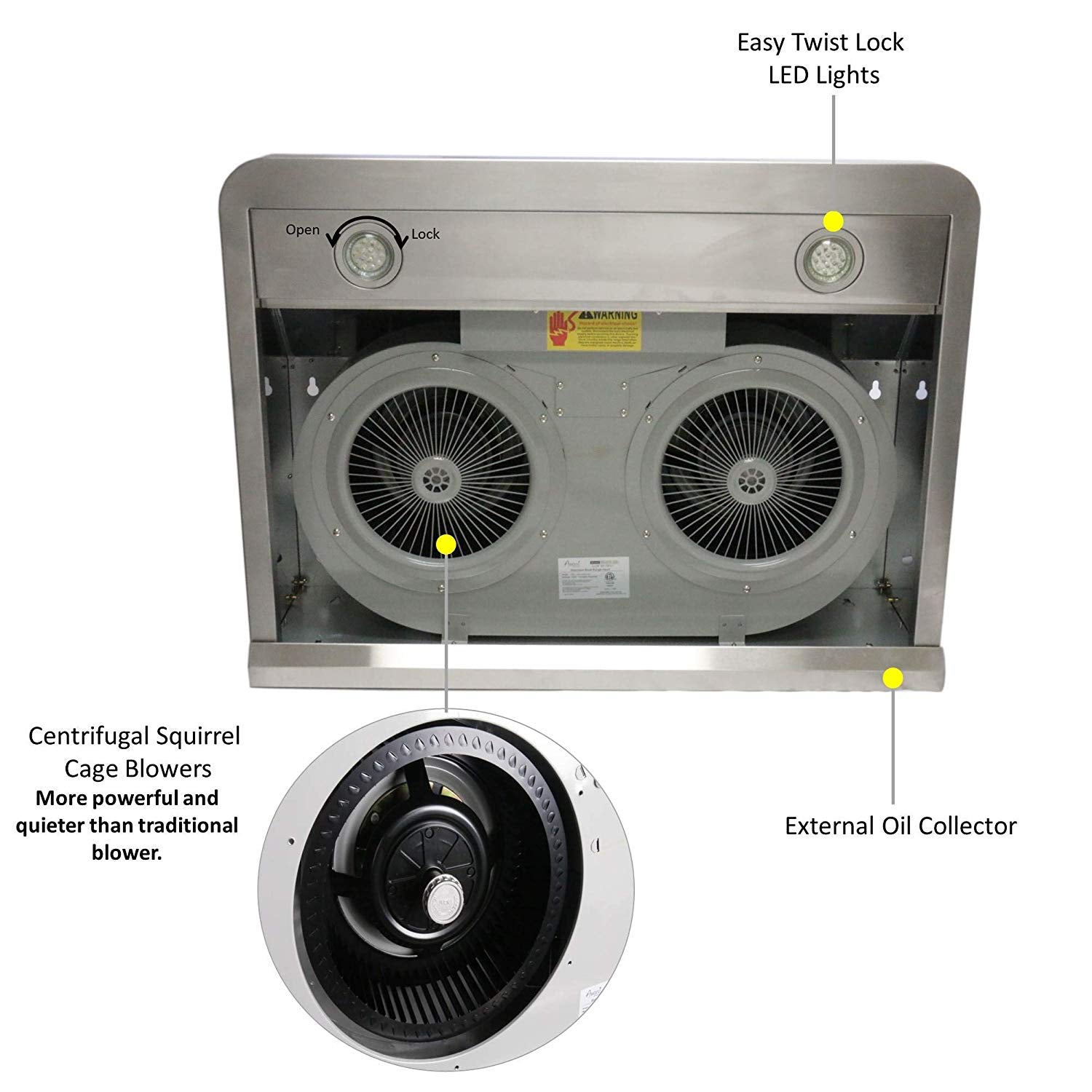 - EXTERNAL OIL COLLECTOR & TWIST LOCK LED LIGHTS - Comes with easily removable external oil collector located in the bottom of the hood. 1 air damper is included on the top. 2 of 3W twist lock removable energy saving cold bright LED lights. Light button operates independently from the power button. It works even when the range hood is not turned on. LED light indicator will illuminate in the LCD display once the lamps are turned on.