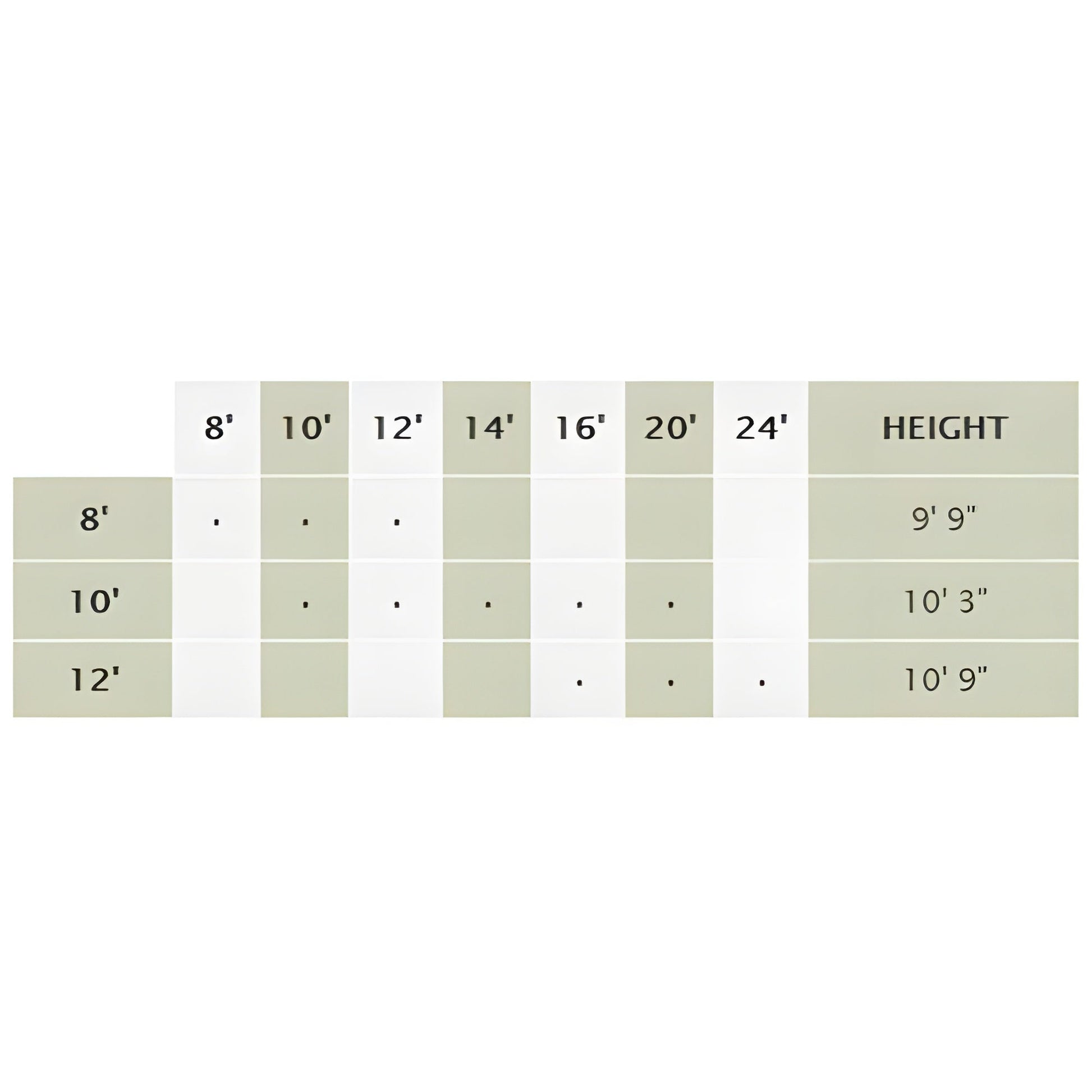 | Size | 8x8', 8x10', 8x12', 10x10', 10x12', 10x14', 10x16', 10x20', 12x16', 12x20', 12x24' |