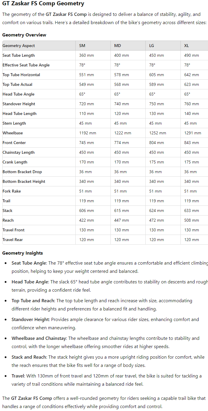 The GT Zaskar FS Comp is crafted to provide a blend of durability, performance, and affordability:
