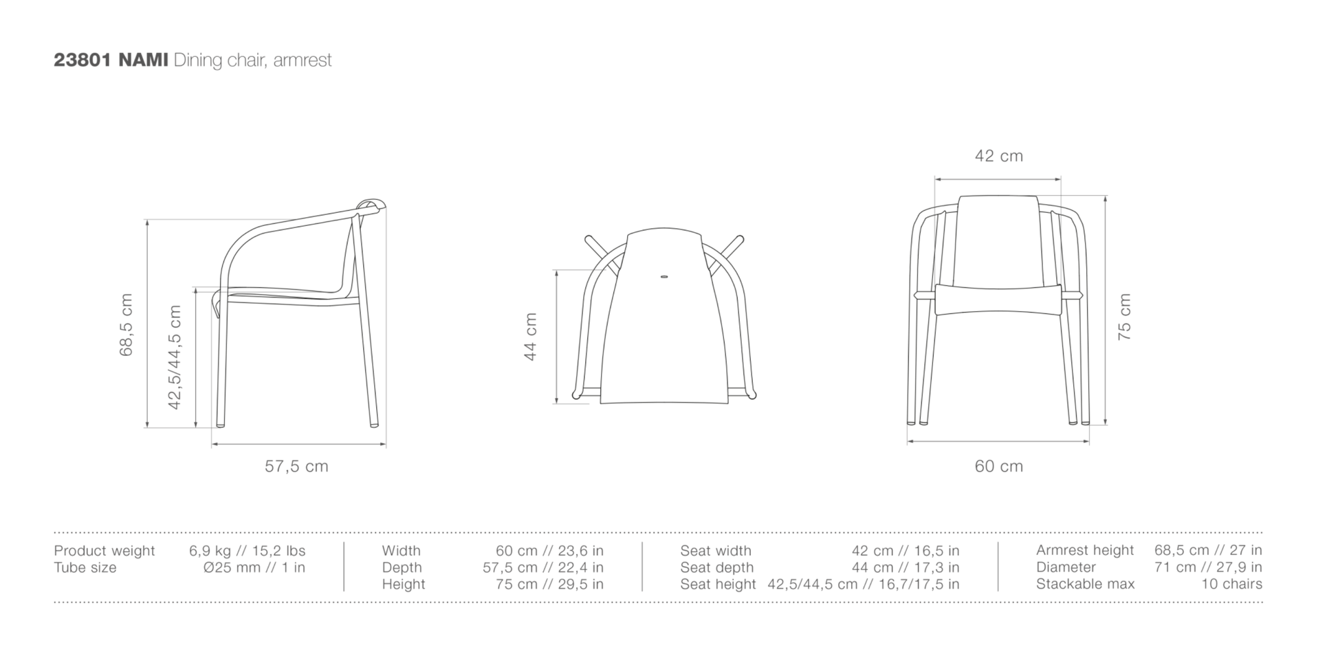 Built for both style and durability, the NAMI Outdoor Dining Chair w/Armrests complements a wide range of outdoor furniture collections. For instance, it pairs beautifully with teak outdoor furniture or a round coffee table. Also, its lightweight design makes stacking simple. Whether placed on a balcony or in a garden, this chair delivers lasting performance while enhancing your outdoor living space.