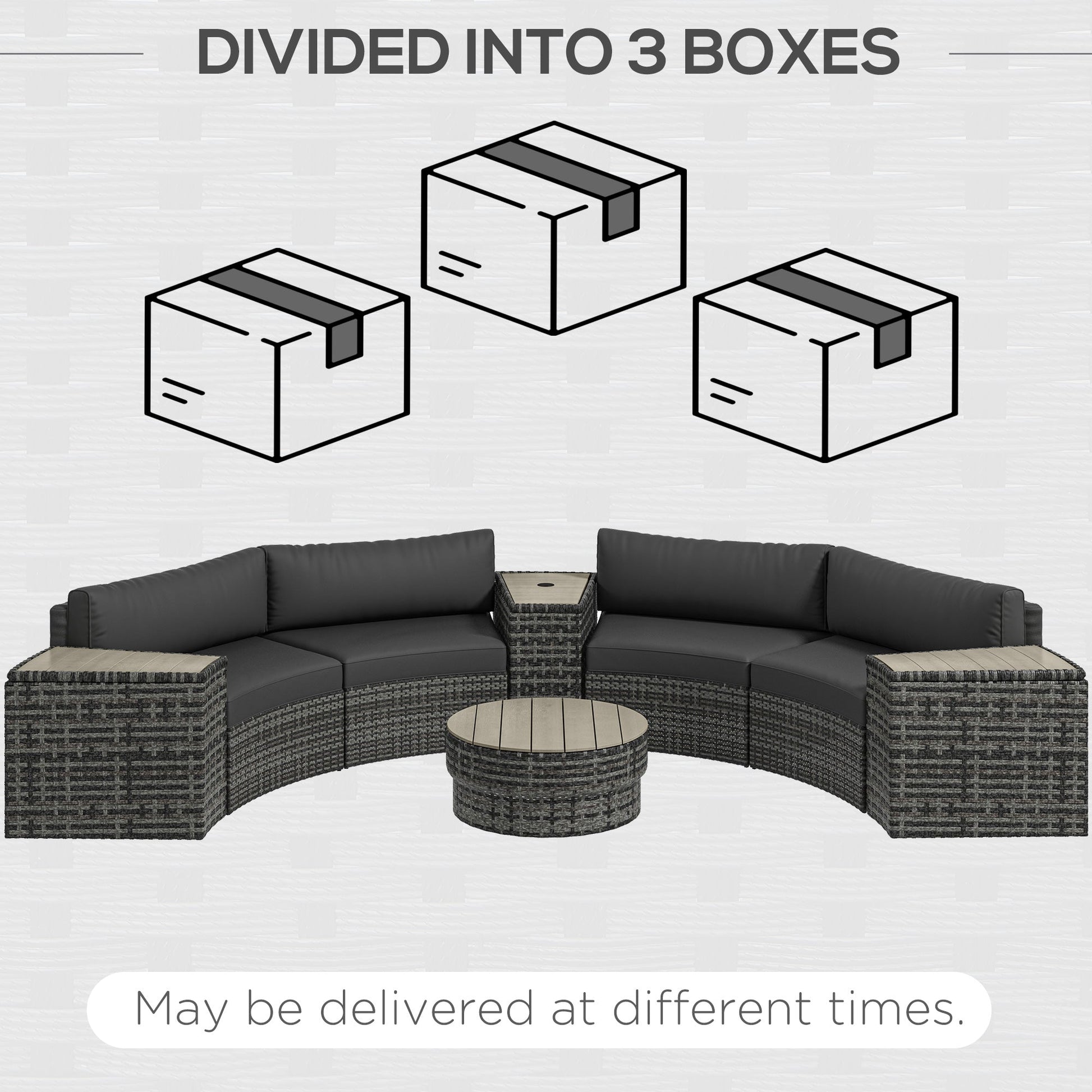 - 8-Piece Outdoor Furniture Set: Our set offers a chic round shape and an abundance of surface space. It includes four sofa chairs, two side tables with hidden storage inside, a middle table, and a round table.