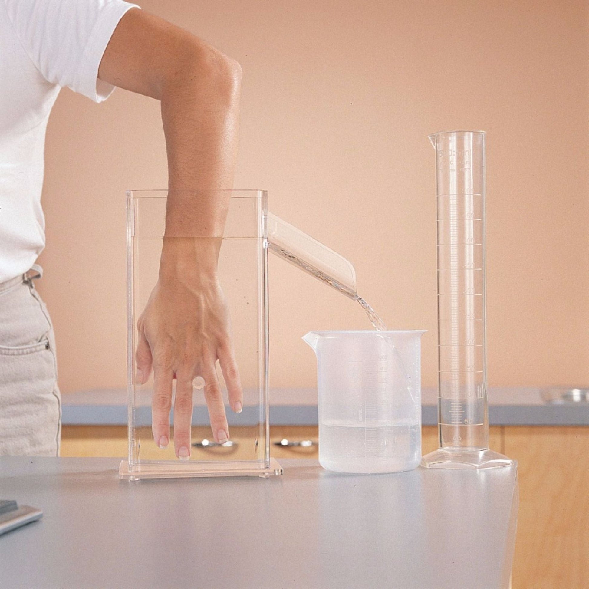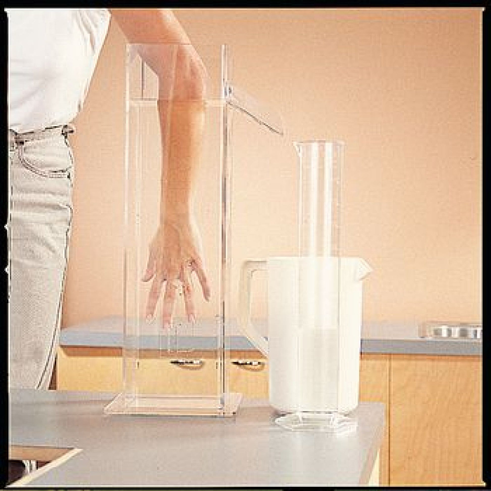 For accurate measurements of edema, the volumeters can be filled with water, place hand in the water, and measure the overflow in the graduated cylinder. The cylinders have no meniscus in order to simplify the reading of it. The Deluxe Volumeter are only made from a single piece of Lucite, thus eliminating three of the side-joints. Deluxe also offers more patient comfort with a rounded top edge.