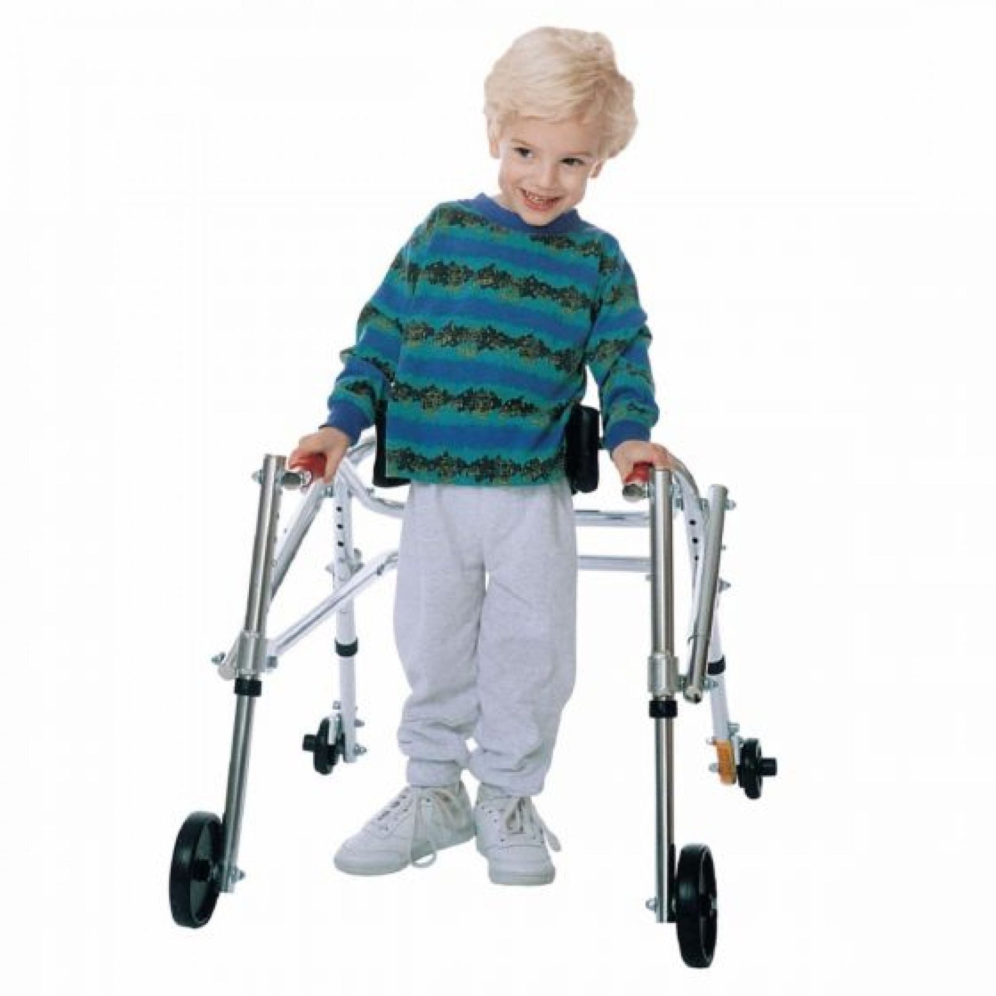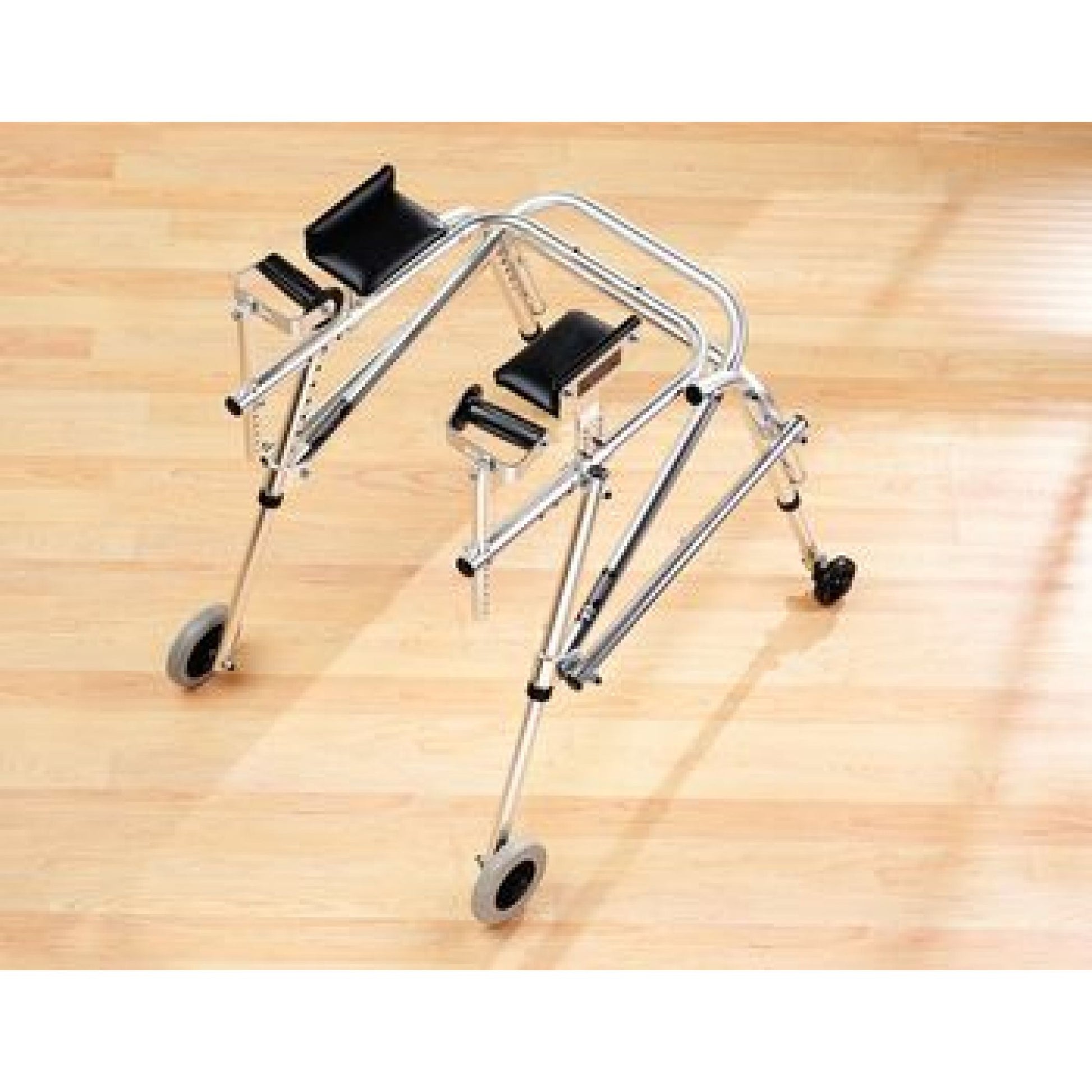 Kaye Reverse Walkers have three horizontal bars behind the user to provide added stability. Uppermost bar intentionally strikes the hip extensors during single-limb stance and facilitates extension on the weight-bearing side. The handgrips have flanged ends that place the user's arms and hands at their side.