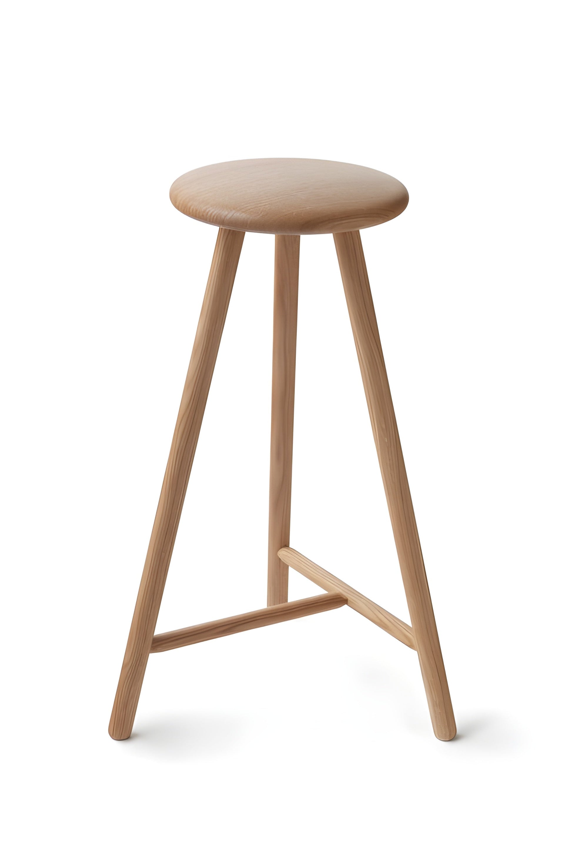 The Nikari Perch Bar Stool brings together modern design and classic Finnish craftsmanship. Inspired by a Helsinki doorknob, this award-winning nikari stool features a rounded oak seat and turned legs. The T-shaped rung arrangement enhances its strength and beauty. Whether used at a home bar or in the kitchen, the Perch Bar Stool offers a sophisticated touch to any interior.