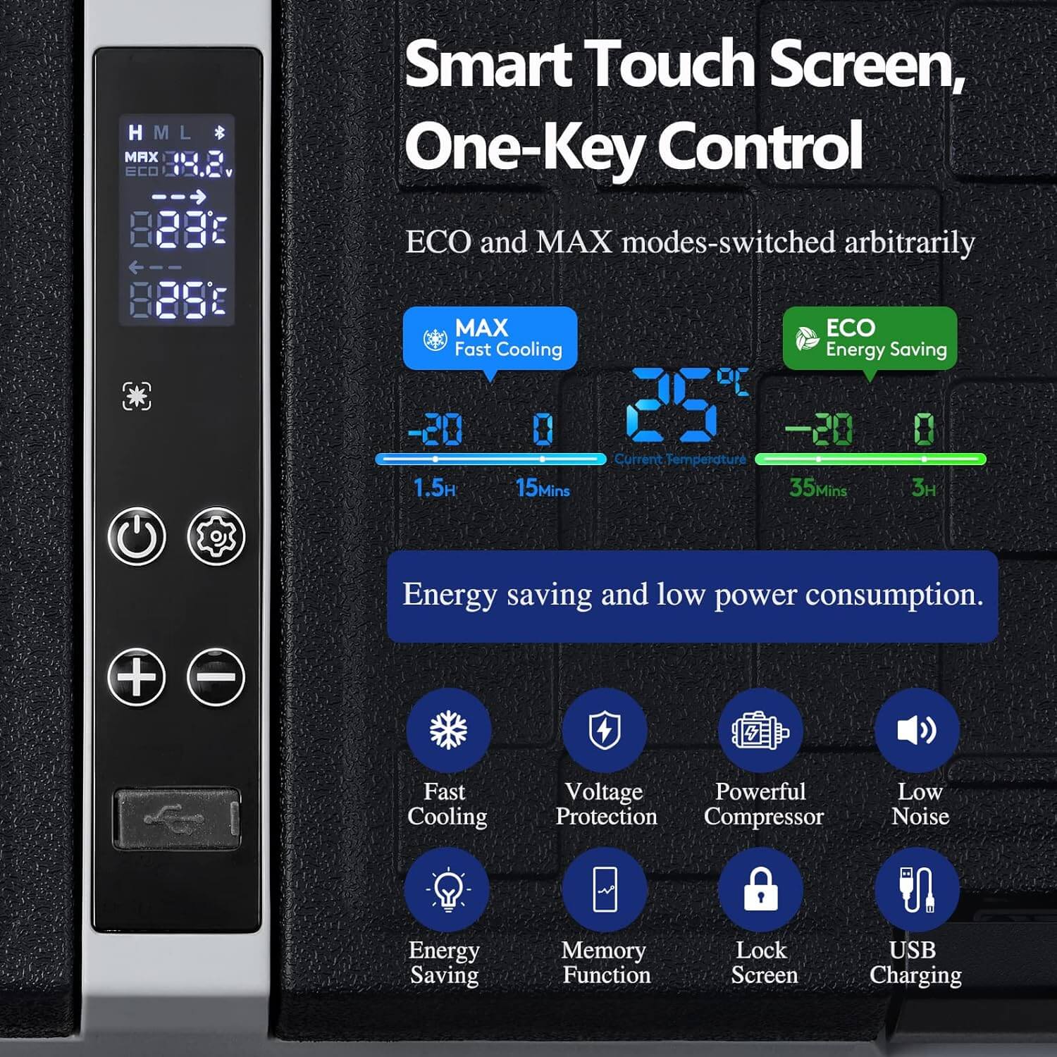 • MAX-FAST COOLING AND ECO-ENERGY SAVING Professional German technology compressor can make the empty portable refrigerator temperature's to 32℉(0℃) within 30 mins by MAX mode, which shortens your waiting time, especially during outdoor activities. It can also be kept cold at the precise temperature you prefer, adjustable in different temperatures between -4°F-68°F (-20°C to 20°C) for chilling or freezing. Keeping your food fresh. No food spoiled, money and space-saving.