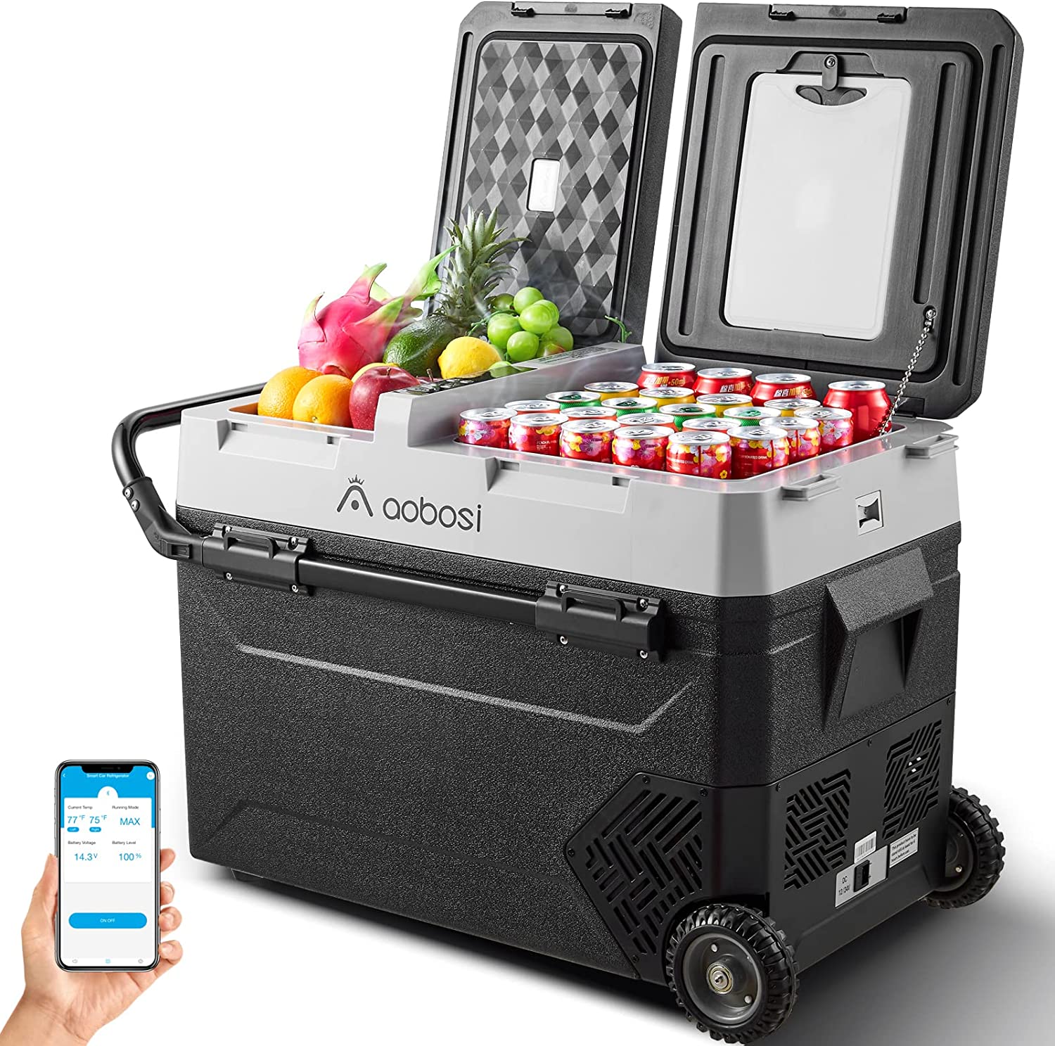 • APP CONTROL AND DUAL ZONE CAR FRIDGEAOBOSI compressor car refrigerator enjoys a large 60 quart capacity, the best companion for short trips, storing up enough drinks and food for your road trip. Two zones of car refrigerator can be independently controlled for temperature. It's up to you to decide which side to use as the freezer zone or fridge zone. Our portable car freezer support App or manual control. (For android and ios)