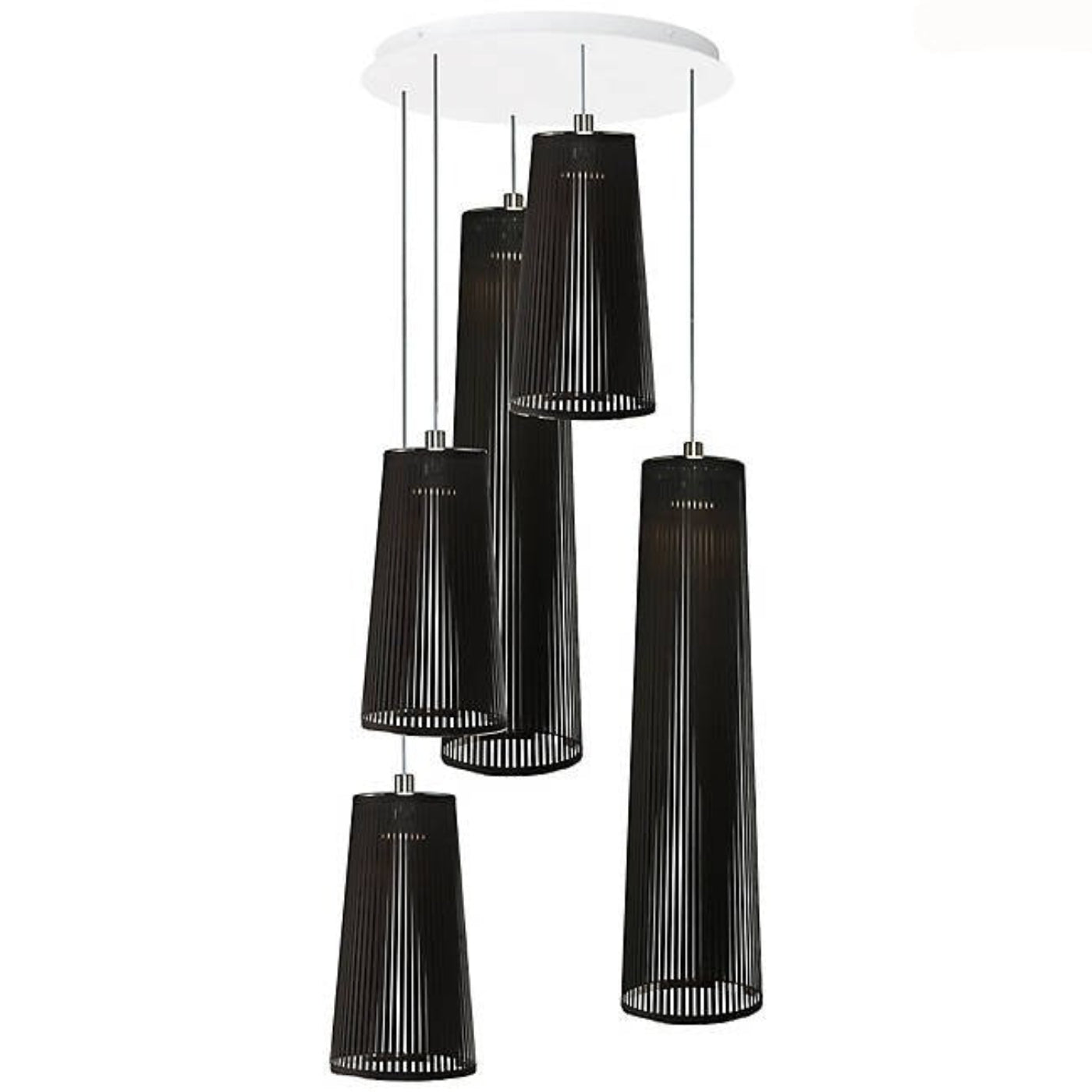 A: A modern chandelier featuring five suspended Solis pendants, combining dramatic light patterns with sleek architectural design.