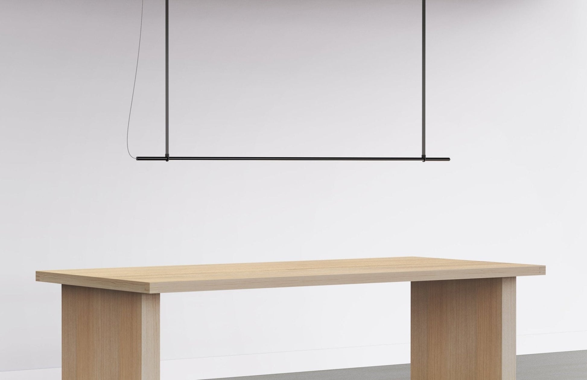 A: A minimalist LED pendant light featuring a slim linear design with a circular wall/ceiling mount for modern interiors.