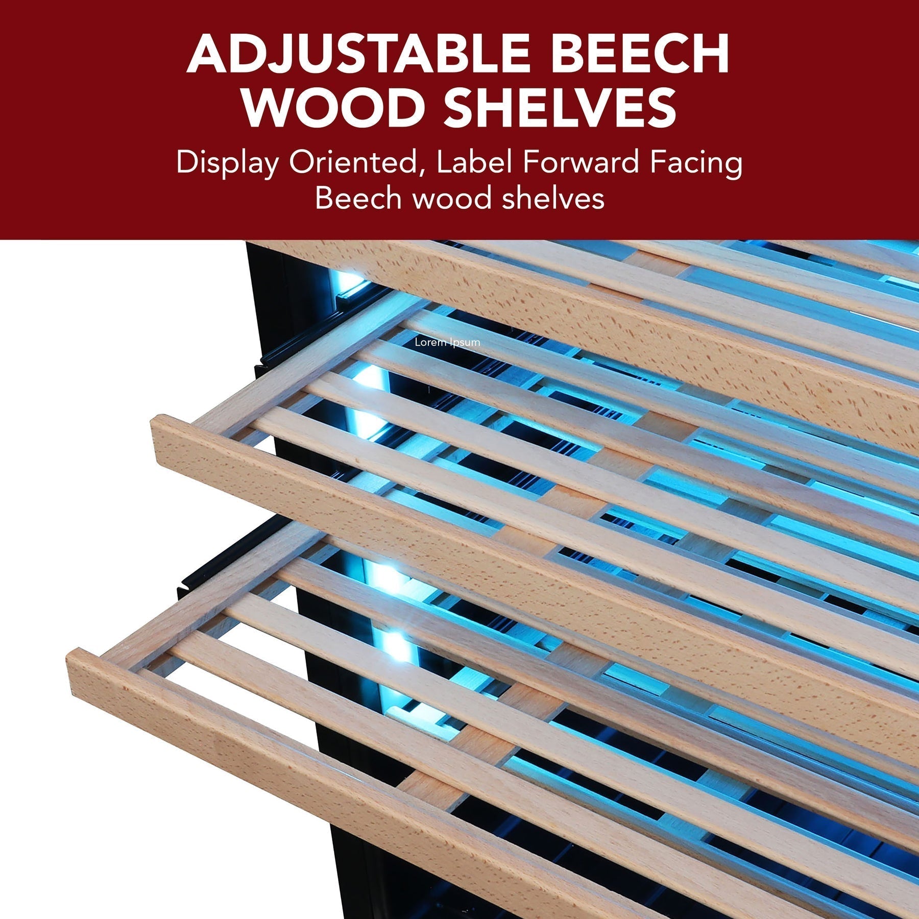 The Vinotemp Vinoglow 41-Bottle Single-Zone Wine Cooler is a masterful creation that combines cutting-edge technology with elegant design, offering wine enthusiasts a superior storage solution. With its patented rear panel, customizable color options, and UV-protected glass doors, this wine cooler ensures that your precious wine collection is stored in optimal conditions. The Vinoglow 41-Bottle Single-Zone Wine Cooler features a patented rear panel that allows you to customize the lighting to suit your preference. This unique feature not only adds a touch of elegance to your wine storage area but also provides functionality by allowing you to easily view and select your wines. Say goodbye to rummaging through your wine bottles to find the one you're looking for. The Vinoglow wine cooler comes with label forward facing racks that allow you to organize your bottles efficiently. This display-oriented design not only enhances the visual appeal of your wine collection but also makes it convenient to access and select your wines. Experience convenience at your fingertips with the Vinotemp Vinoglow wine cooler's touch control panel. The TFT LCD display provides a clear and user-friendly interface, while the integrated RGB color wheel allows you to customize the lighting to create the ambiance you desire. Adjusting the settings of your wine cooler has never been easier. Protect the quality and taste of your wines with the UV-resistant glass doors. UV rays can degrade the flavor and aroma of wines over time, but with this feature, you can be rest assured that your wines are shielded from harmful light exposure. Ensure the optimal storage conditions for your wines with the temperature and door alarm features. You will be alerted if there are any fluctuations in temperature or if the door is left ajar, allowing you to take immediate action to preserve the quality of your wines. The Vinotemp Vinoglow wine cooler offers a temperature range of 39Β°-68Β°F, ideal for storing both red and white wines at their recommended serving temperatures. This precise temperature control ensures that your wines age gracefully and are ready to be enjoyed at their best. For those observant of the Sabbath, it features a Sabbath mode, allowing you to disable certain electrical features for religious observance while still maintaining the desired temperature for your wines. The adjustable beech wood shelves of the wine cooler can extend up to 90%, providing flexibility to accommodate various bottle sizes and shapes. The natural beauty of the beech wood complements the aesthetics of your wine collection while ensuring secure and stable storage. With the reversible door feature of the Vinoglow wine cooler, you can customize the door swing direction to suit the layout of your space. This flexibility allows for seamless integration of the wine cooler into your environment, enhancing both functionality and aesthetics. Rest easy knowing that your wine collection is protected with the security lock feature of the Vinotemp Vinoglow wine cooler. The lock provides an added layer of security, ensuring that only authorized individuals have access to your prized wines. Invest in the Vinotemp Vinoglow wine cooler and enhance the preservation and presentation of your prized wine collection.